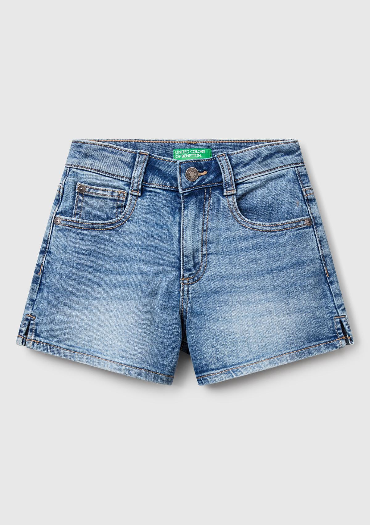 Kız Çocuk Açık Denim Taş Yıkama Logo İşlemeli Streç Denim Şort