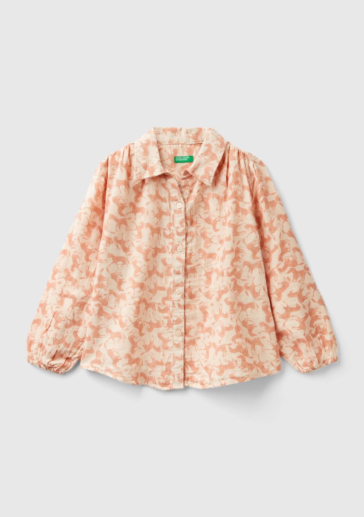 Saf pamuklu kumaştan üretilmiş, klasik yakalı, önü düğmeli ve uzun kollu kız çocuk gömlek modeli. Tamamı at motifi baskılı tasarımıyla kalabalıklar arasında stiliyle öne çıkmak isteyen kız çocukları için uygun bir seçim. Neşeli ve dinamik kombinler için birebir!