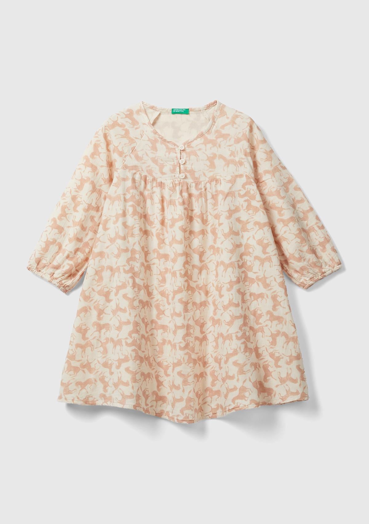 Saf pamuklu kumaştan üretilmiş, tamamı at desenli, kolları büzgülü, önü düğmeli, uzun reglan kollu, bisiklet yaka kız çocuk elbise. Çarpıcı kesimiyle trend ve modern görünümleri günlük stile taşır. Rahatlıktan ödün vermeden göz alıcı kombinler oluşturmak isteyen minik moda tutkunları için ideal.