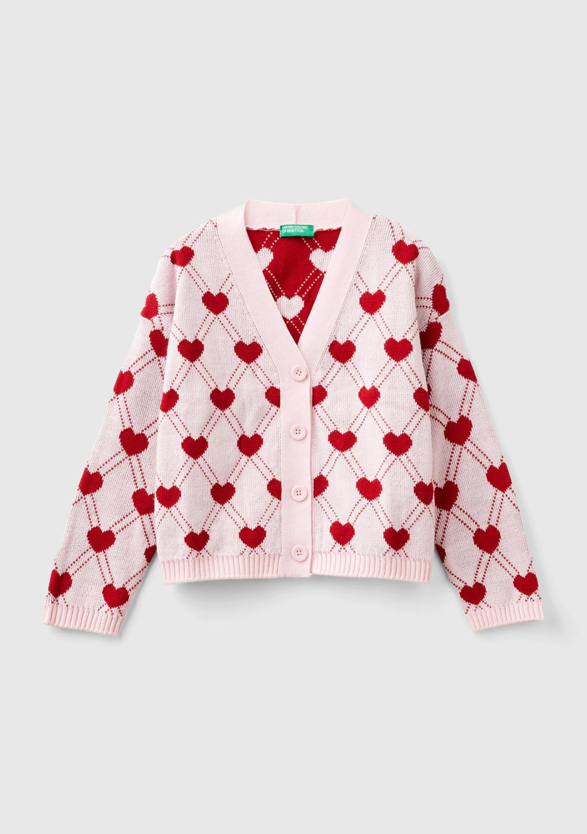 Kız Çocuk Açık Pembe Tamamı Kalp Desenli 4 Düğmeli V Yaka Hırka