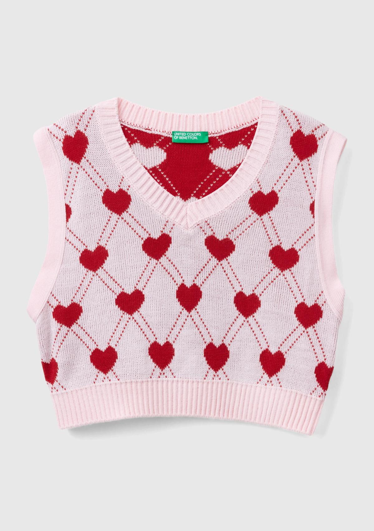 Kız Çocuk Açık Pembe Tamamı Kalp Desenli Kolsuz V Yaka Süveter