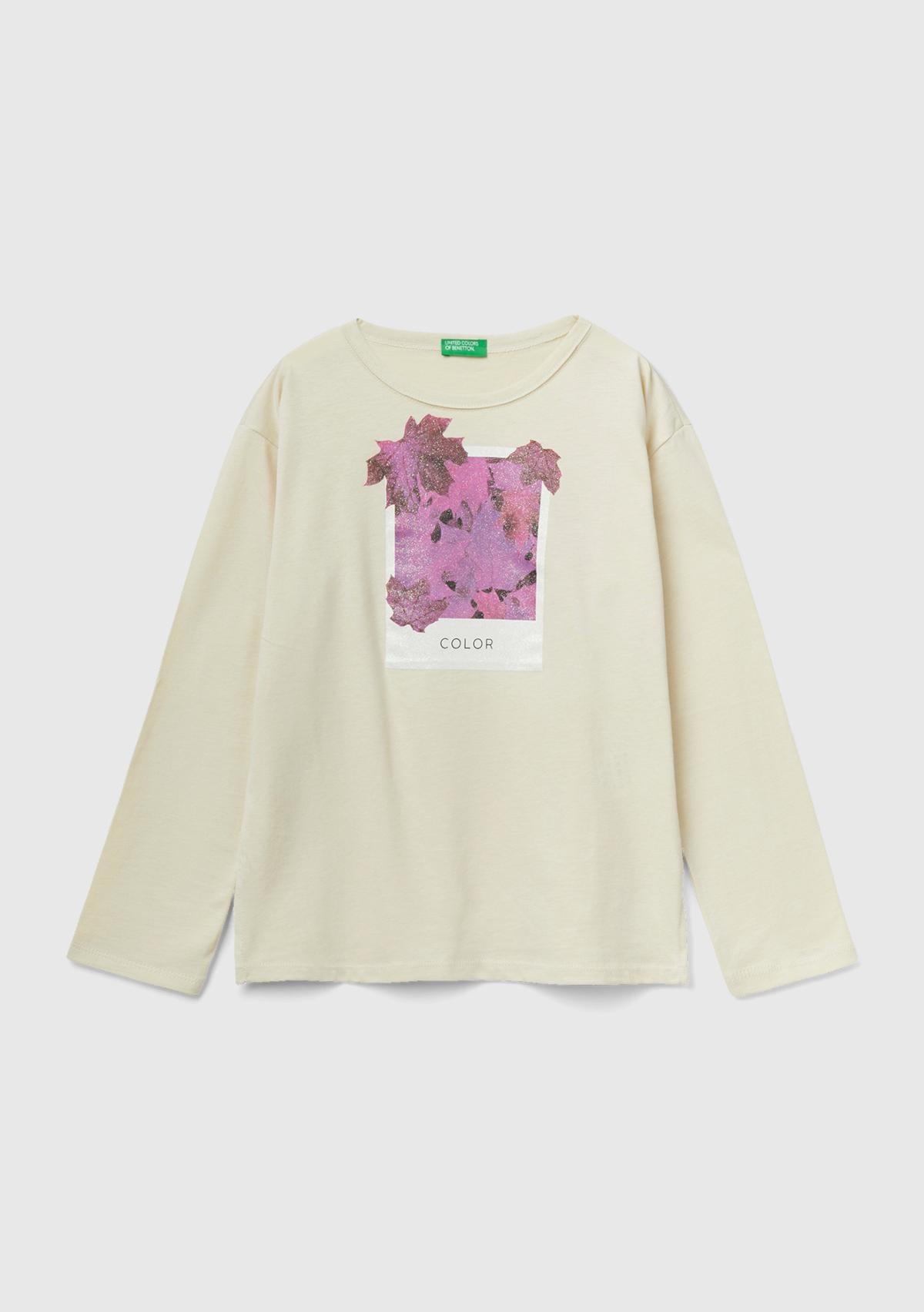 Kız Çocuk Bej Düşük Omuzlu Baskılı T-Shirt