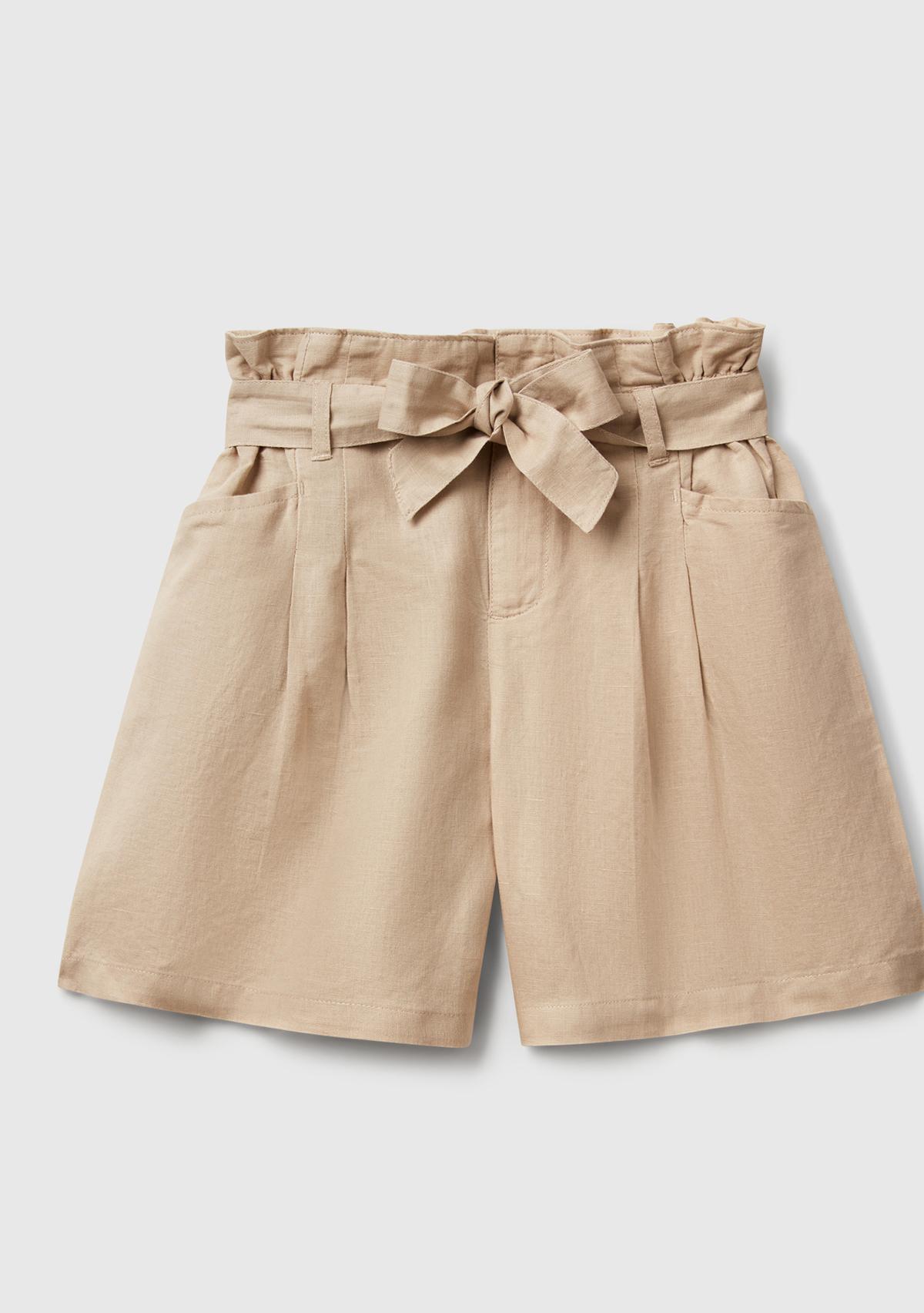 Kız Çocuk Bej Keten Karışımlı Beli Kuşaklı Wide Fit Bermuda Şort