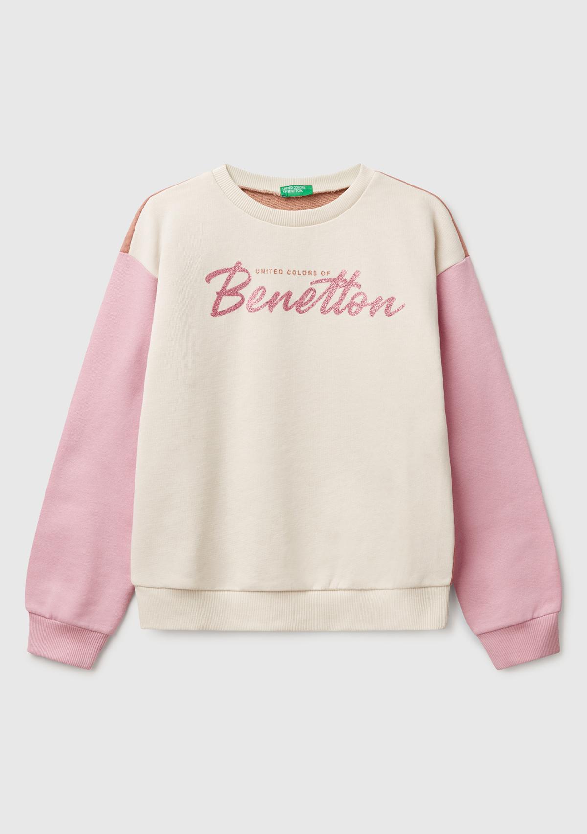 Kız Çocuk Bej Mix Simli Benetton Logo Baskılı Bisiklet Yaka Sweatshirt