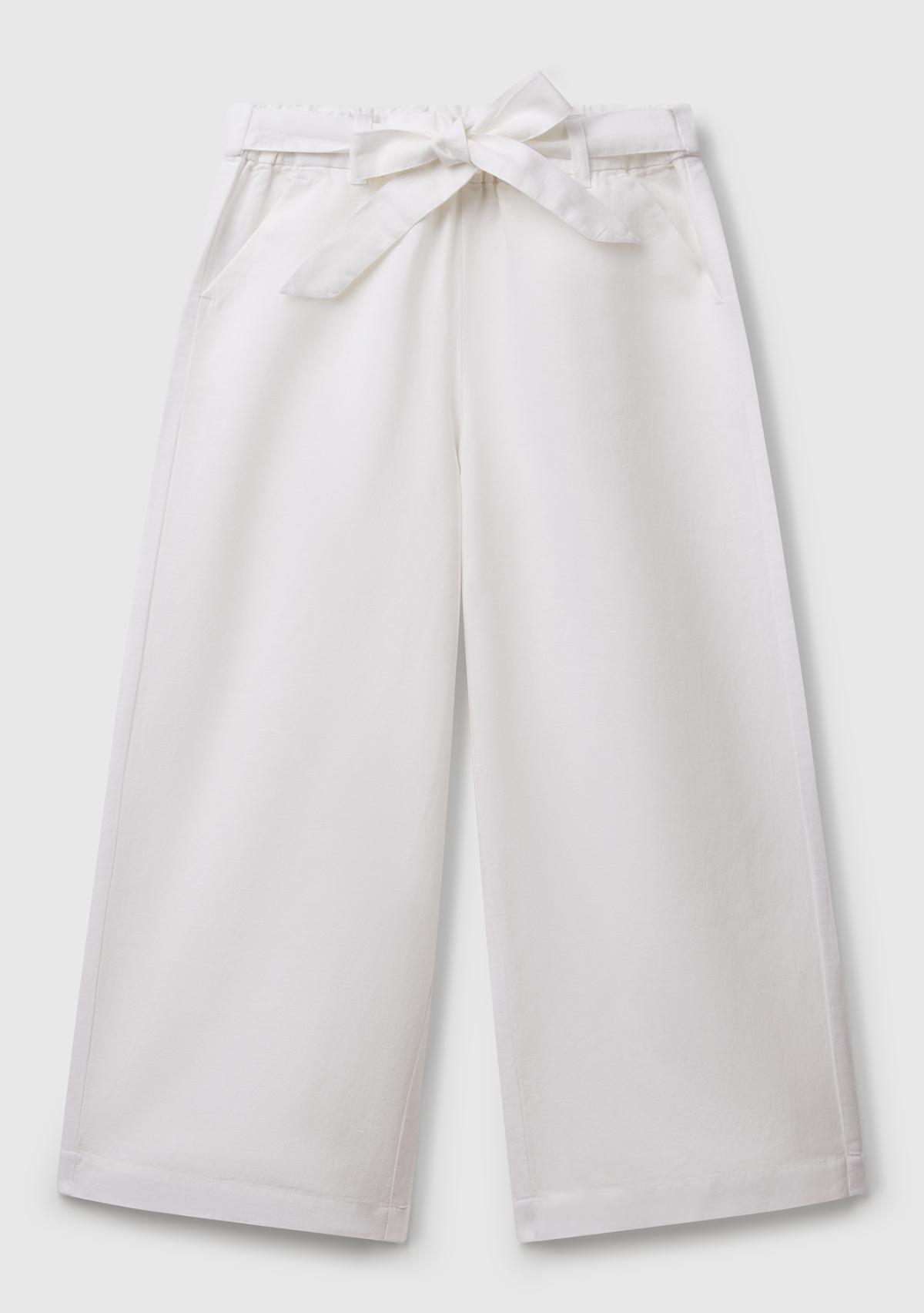 Kız Çocuk Beyaz Keten Karışımlı Beli Dikişli Kuşaklı Geniş Paça Pantolon