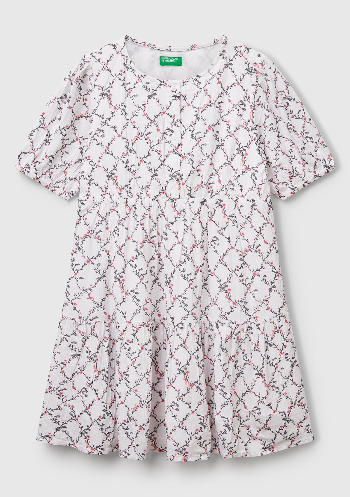 Kız Çocuk Beyaz Mix Viskozlu Desenli Önü Düğmeli Pileli Katlı Kısa Kollu Elbise