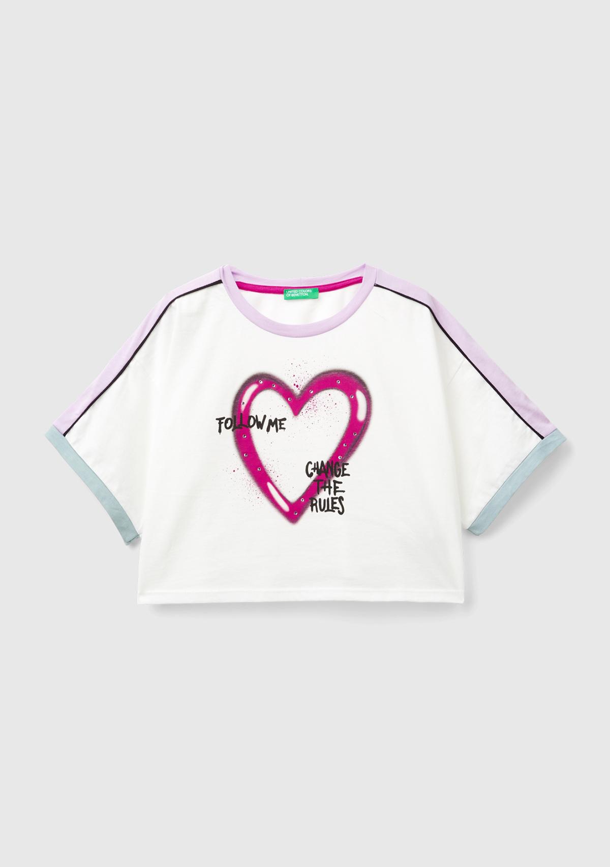Kız Çocuk Beyaz Önü Baskılı Kontrast Renkli Geniş Bisiklet Yaka T-Shirt