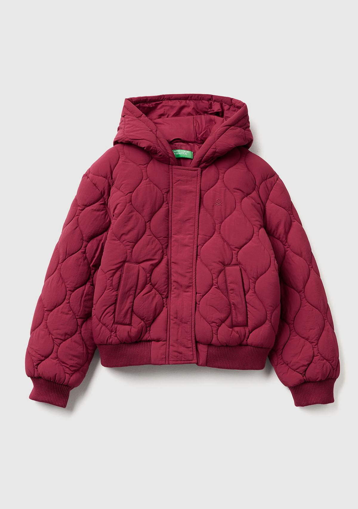 Kız Çocuk Bordo Logo İşlemeli Kapitone Fermuarlı Nervürlü Kapüşonlu Ceket