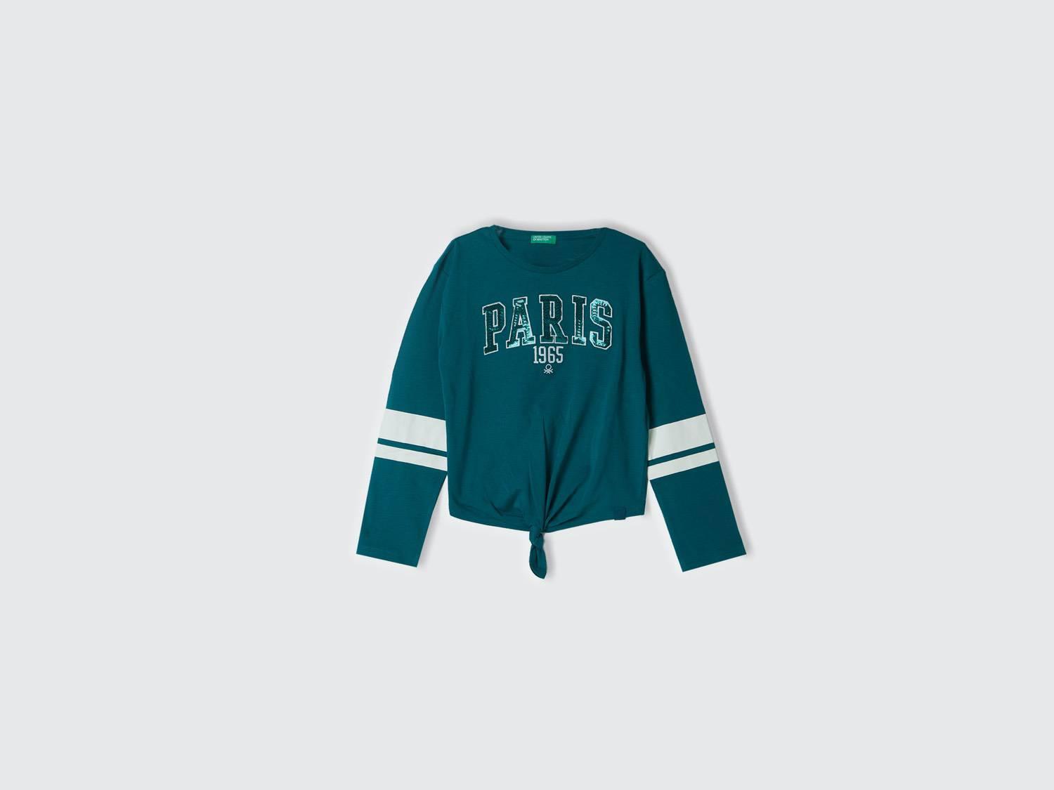 Kız Çocuk Çam Yeşili Kontrast Renkli Önü Düğümlü Kayık Yaka Uzun Kollu T-Shirt