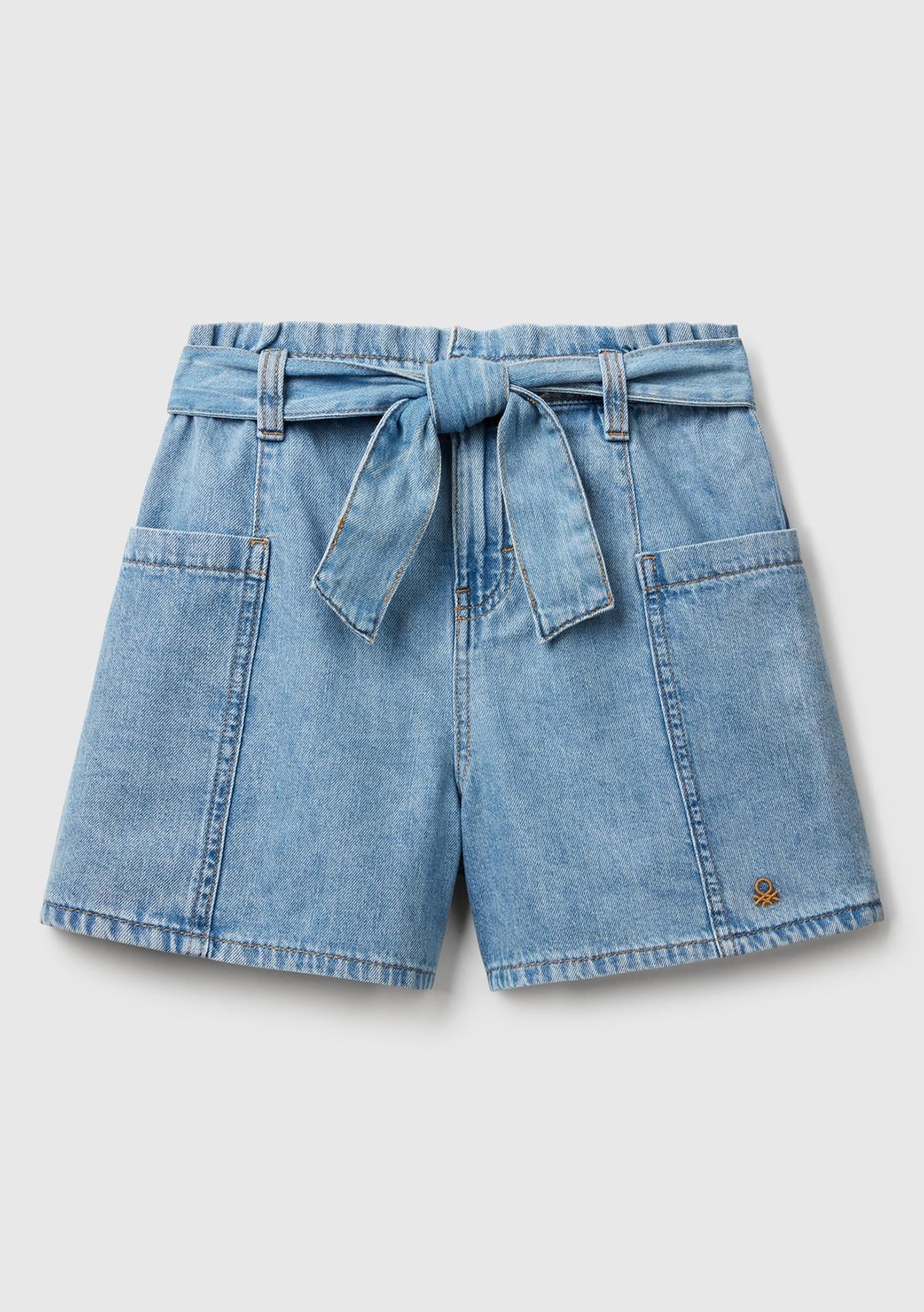 Kız Çocuk Denim Kuşaklı Beli Büzgülü Logolu Yan Cepli Denim Bermuda Şort