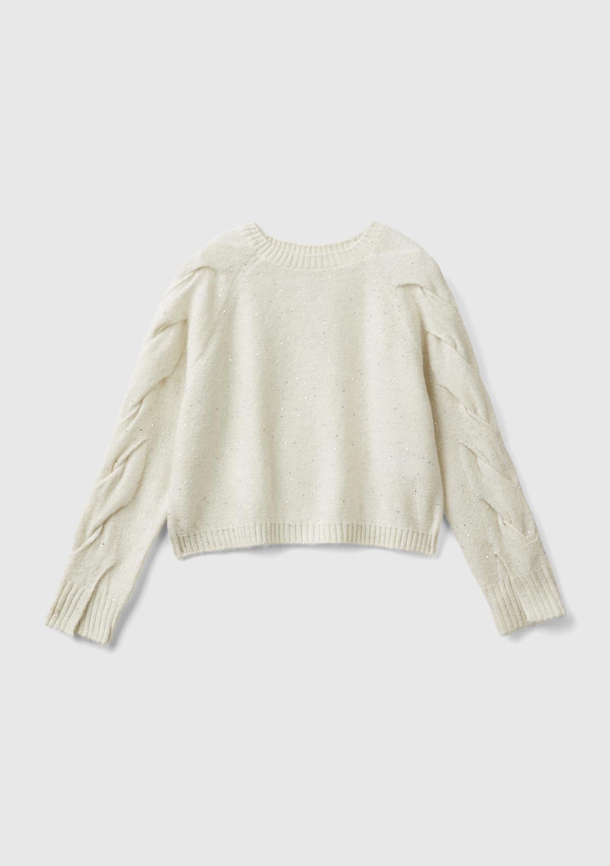 Kız Çocuk Ekru Kolları Örgü Detaylı Bisiklet Yaka Kısa Kazak