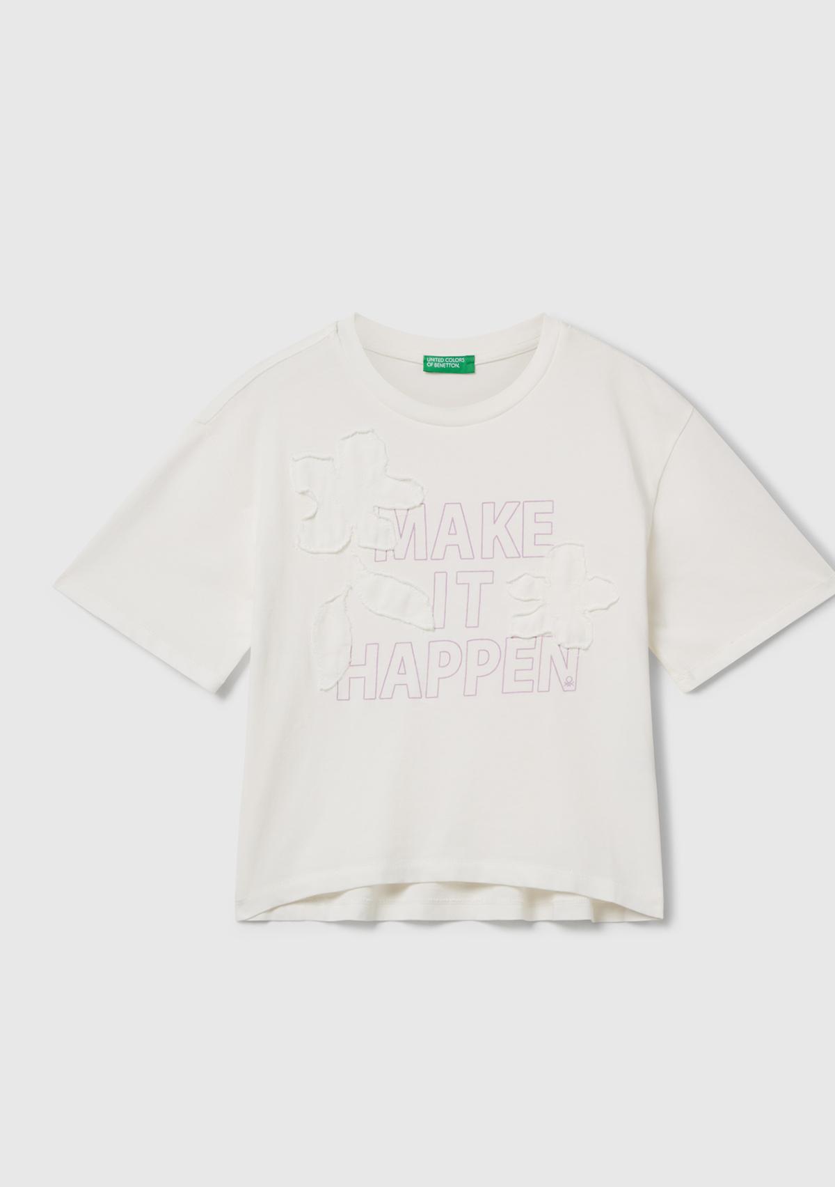 Kız Çocuk Ekru Önü Baskılı Aplikeli Ribana Yakalı Relaxed Fit T-shirt
