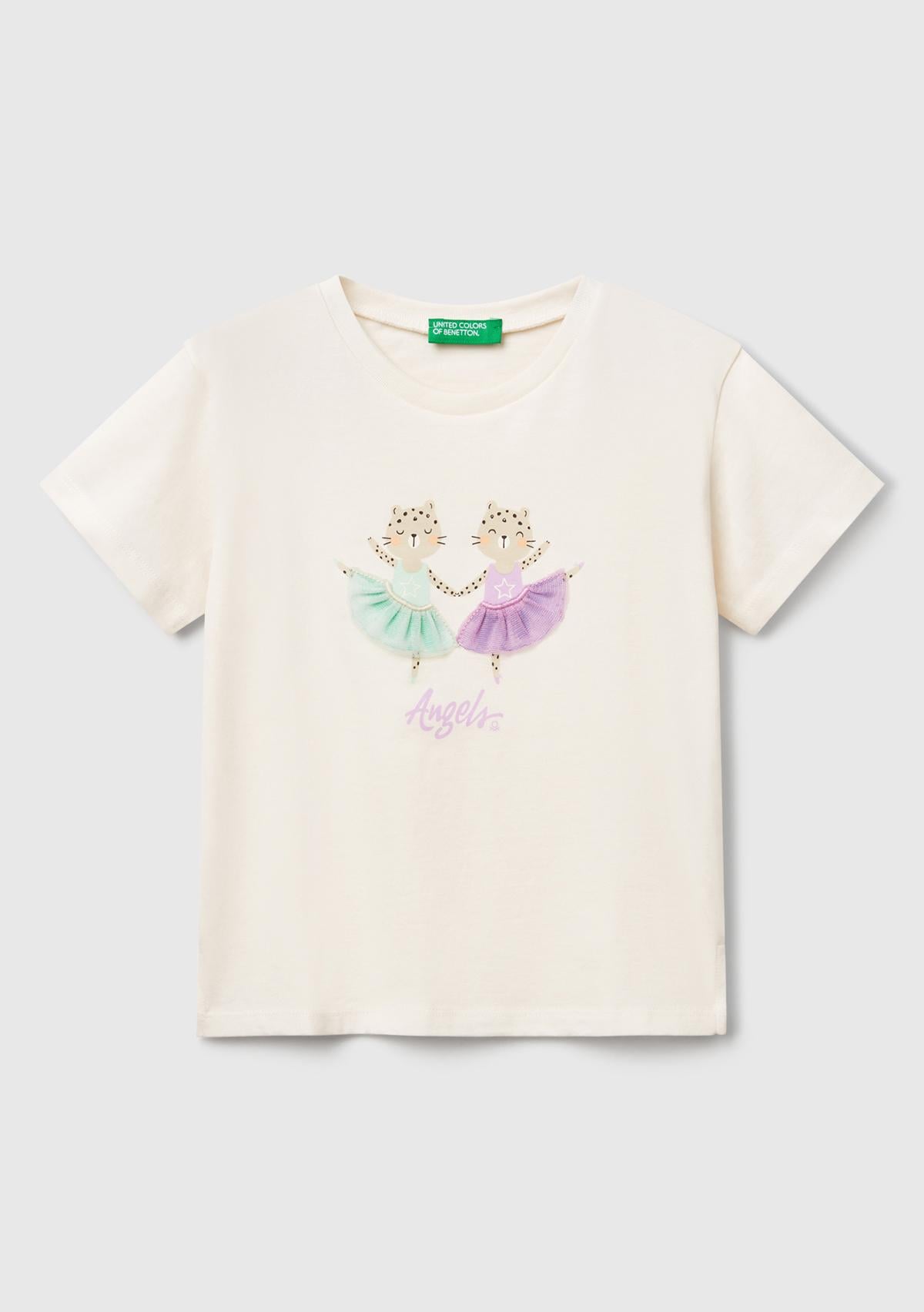 Kız Çocuk Ekru Önü Baskılı Tül Aplikli Yırtmaçlı T-Shirt