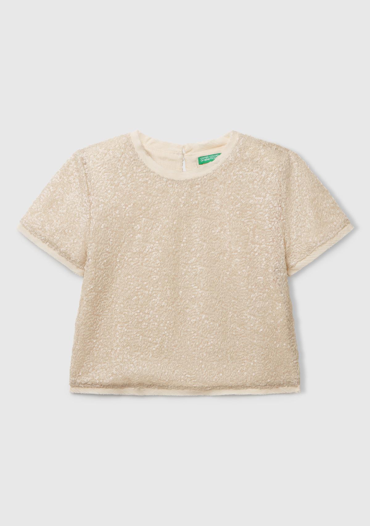 Kız Çocuk Ekru Payetli Tül Astarlı Arkası Tek Düğmeli Kısa Kollu Bluz