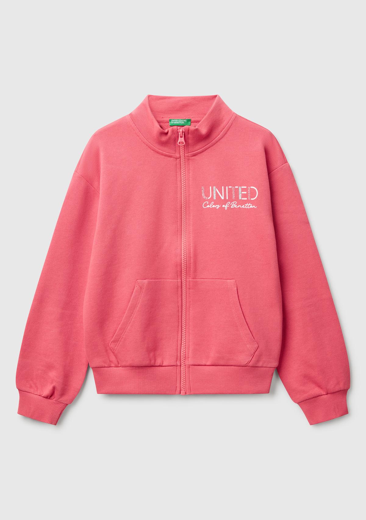 Kız Çocuk Fuşya Simli Benetton Logo İşlemeli Fermuarlı Sweatshirt