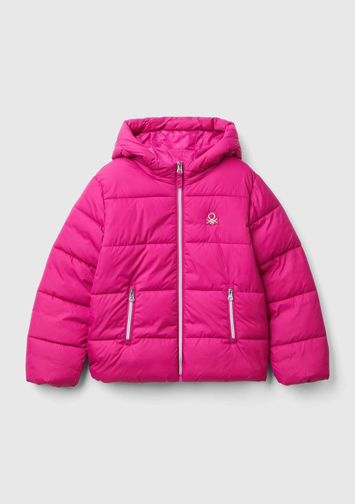 Kız Çocuk Fuşya Sol Göğsü Logo İşlemeli Cepli Kapüşonlu Yüksek Yaka Mont