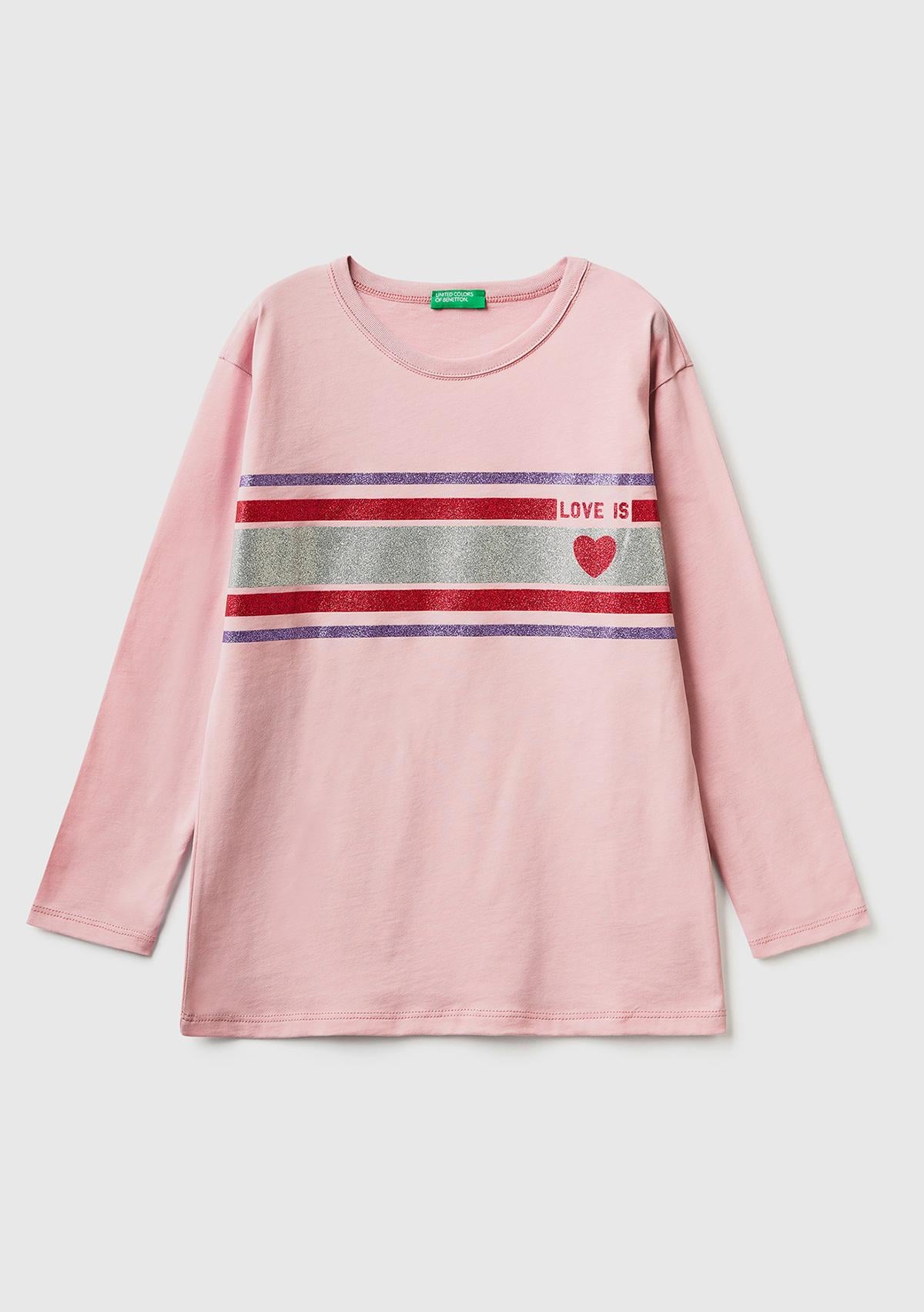 Kız Çocuk Gül Kurusu Göğsü Şerit Baskılı T-Shirt