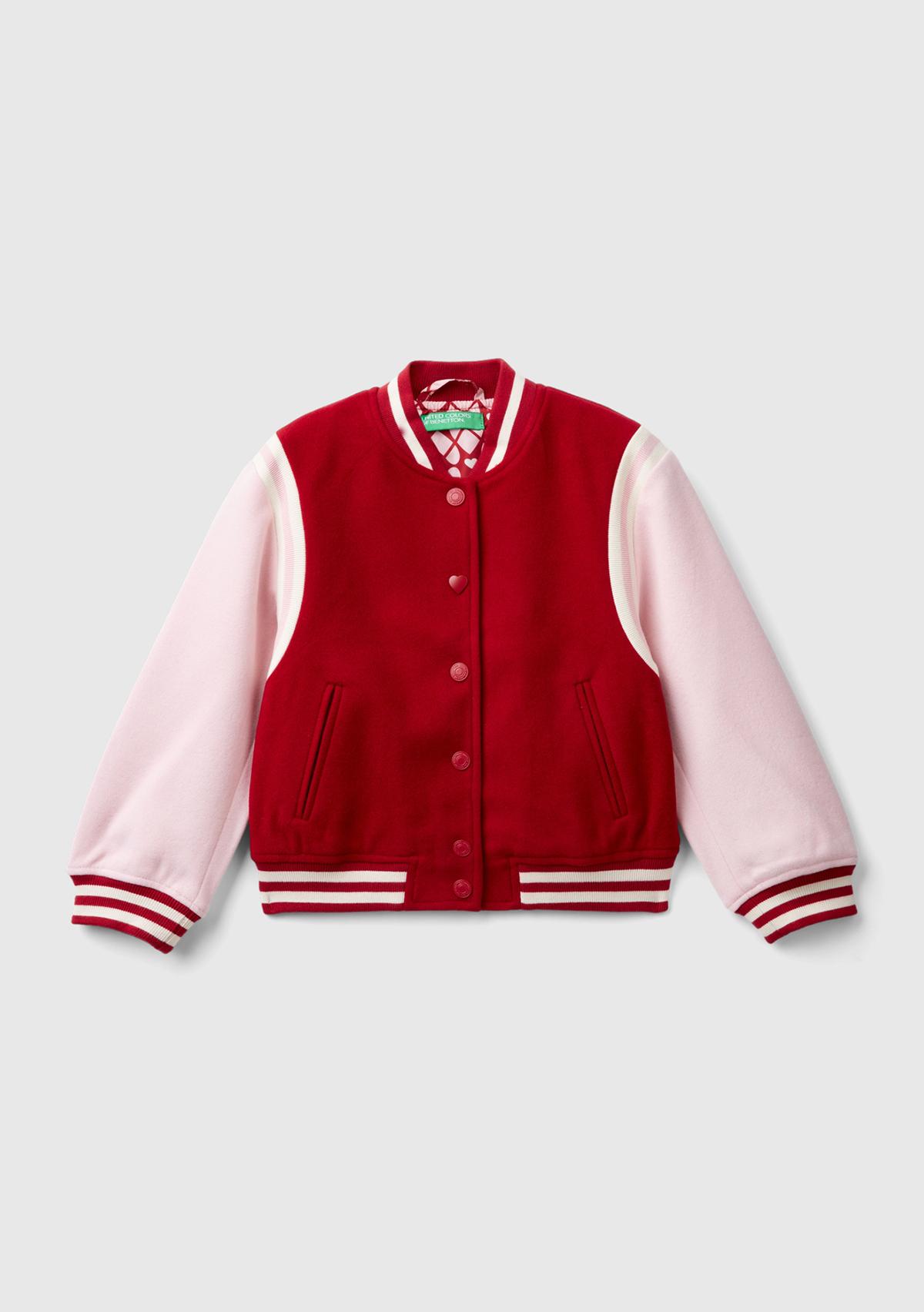 Kız Çocuk Kırmızı Arkası Logo Detaylı Kontrast Renkli Kalpli Düğmeli Bomber Ceket