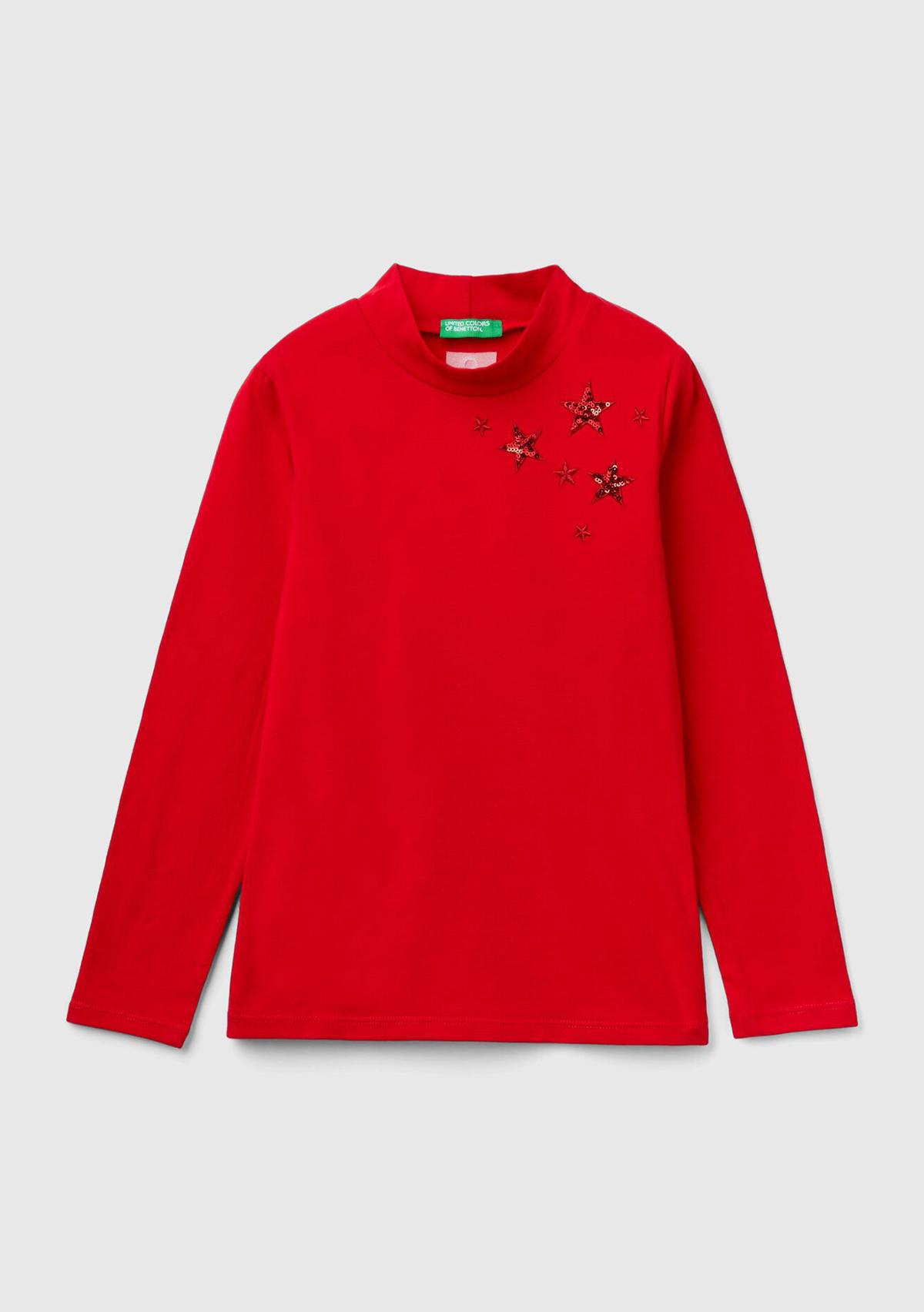 Kız Çocuk Kırmızı Arkası Logolu Omzu Pul Detaylı Dik Yaka Uzun Kollu T-Shirt