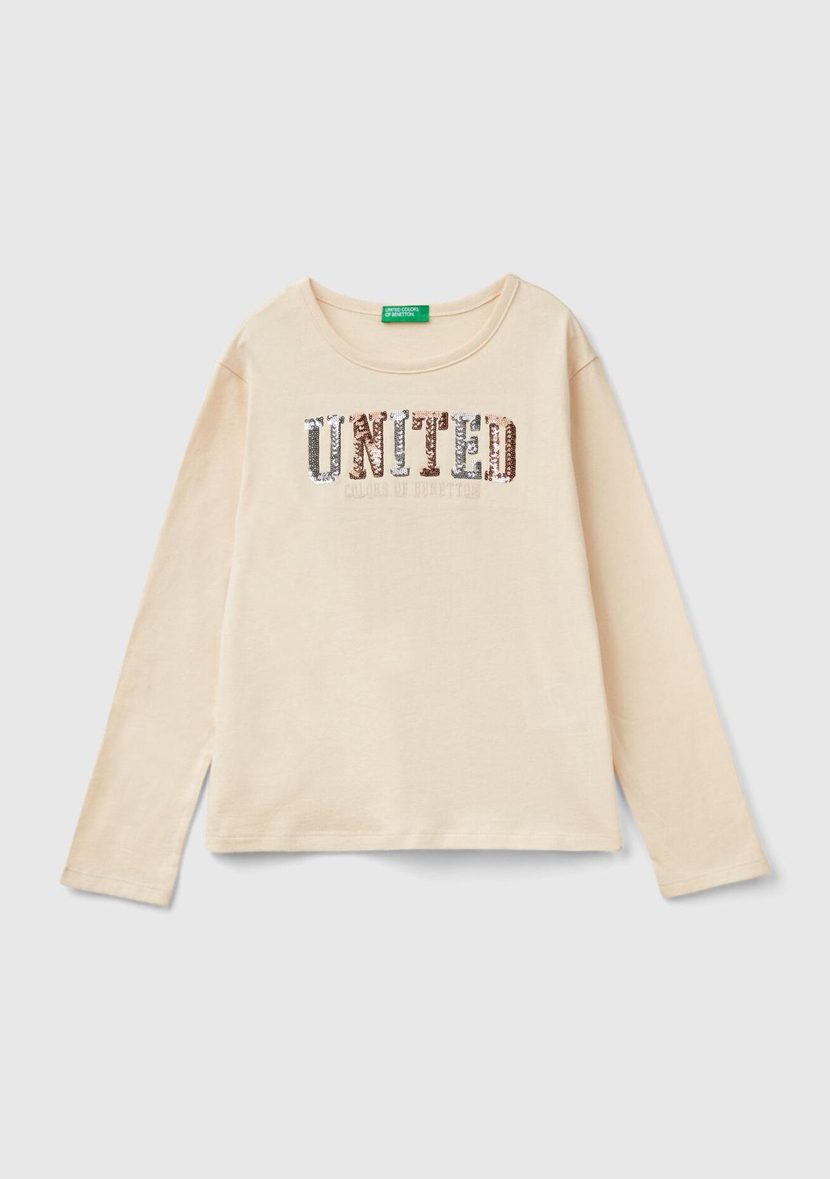 Kız Çocuk Krem Önü Pullu Logo İşlemeli Bisiklet Yaka Uzun Kollu T-Shirt