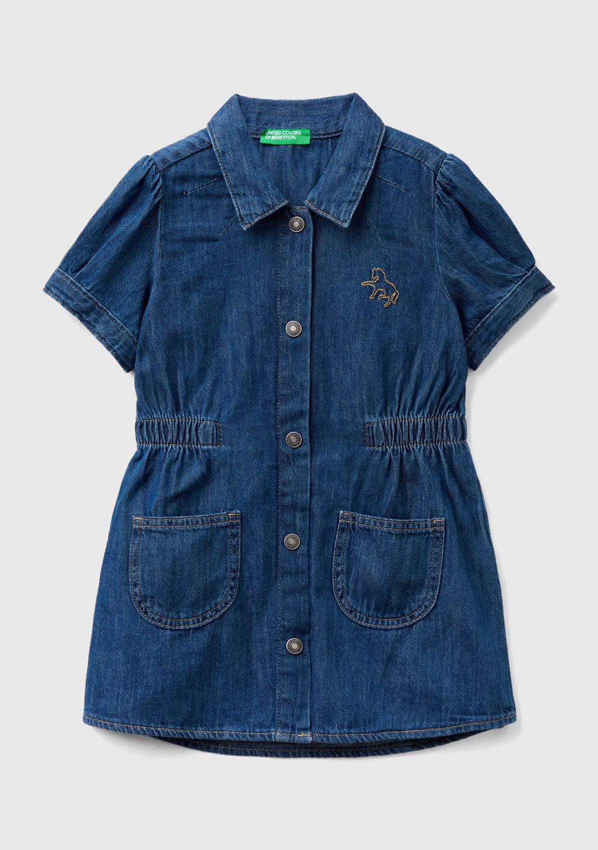 Saf pamuklu hafif kottan üretilmiş, gömlek yakalı, önü çıtçıt düğmeli, kısa kollu, denim kumaş kız çocuk mini elbise. Arkası ve yanları iç lastikli, önü cep aplikeli ve sol göğsü at motifi işlemeli. Eskitilmiş efektli trend görünümüyle stil sahibi kız çocuklarının tercihi!