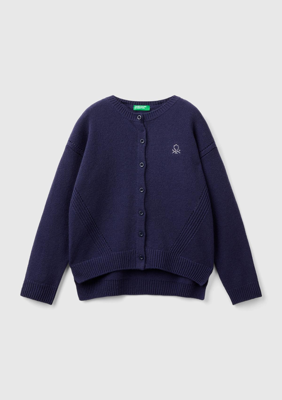 Kız Çocuk Lacivert Önü Düğmeli Nervür Detaylı Hırka. Koyun Yünü İçerir
