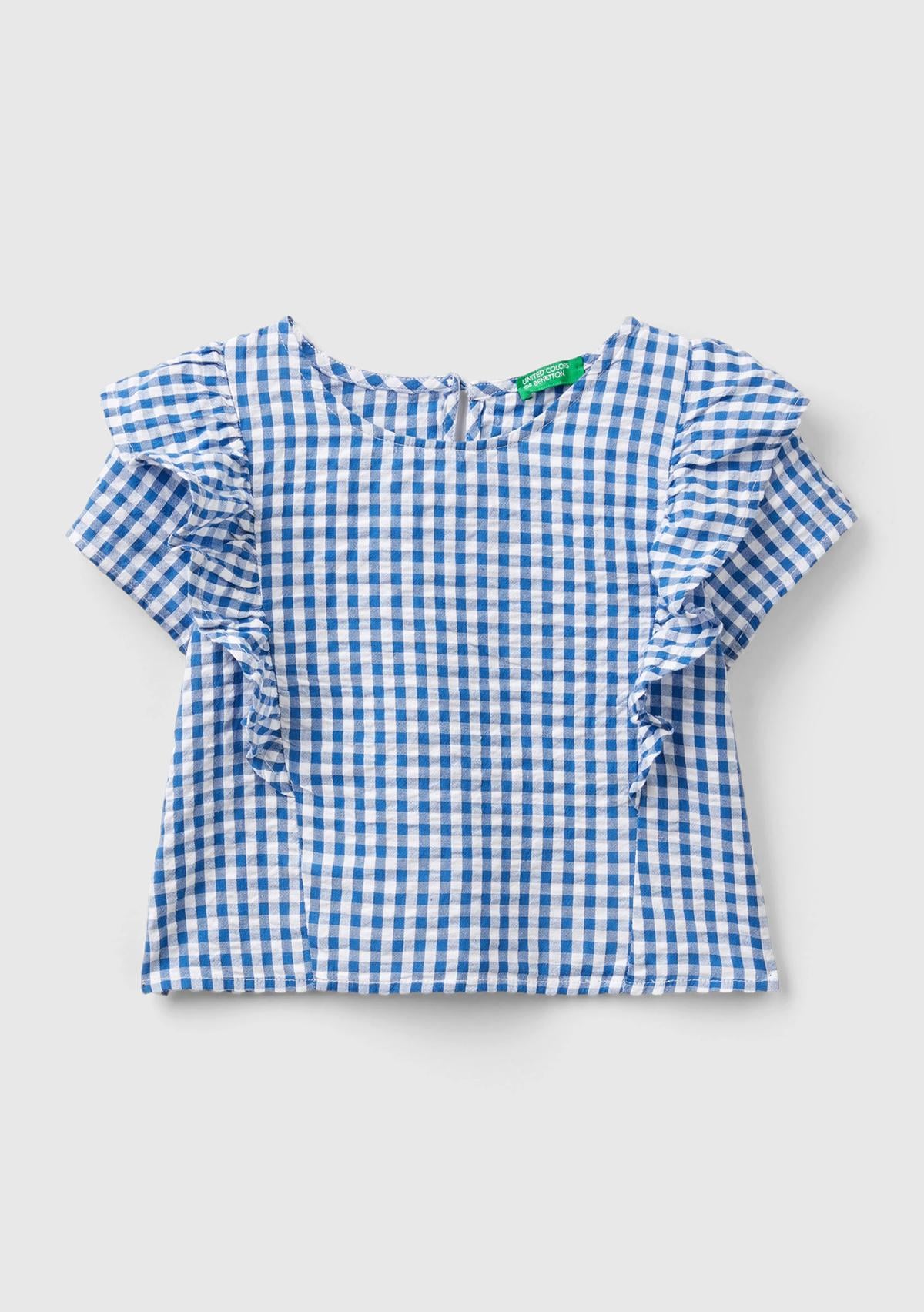 Kız Çocuk Mavi-Beyaz Tamamı Desenli Önü ve Arkası Fırfır Detaylı Düğmeli Bluz
