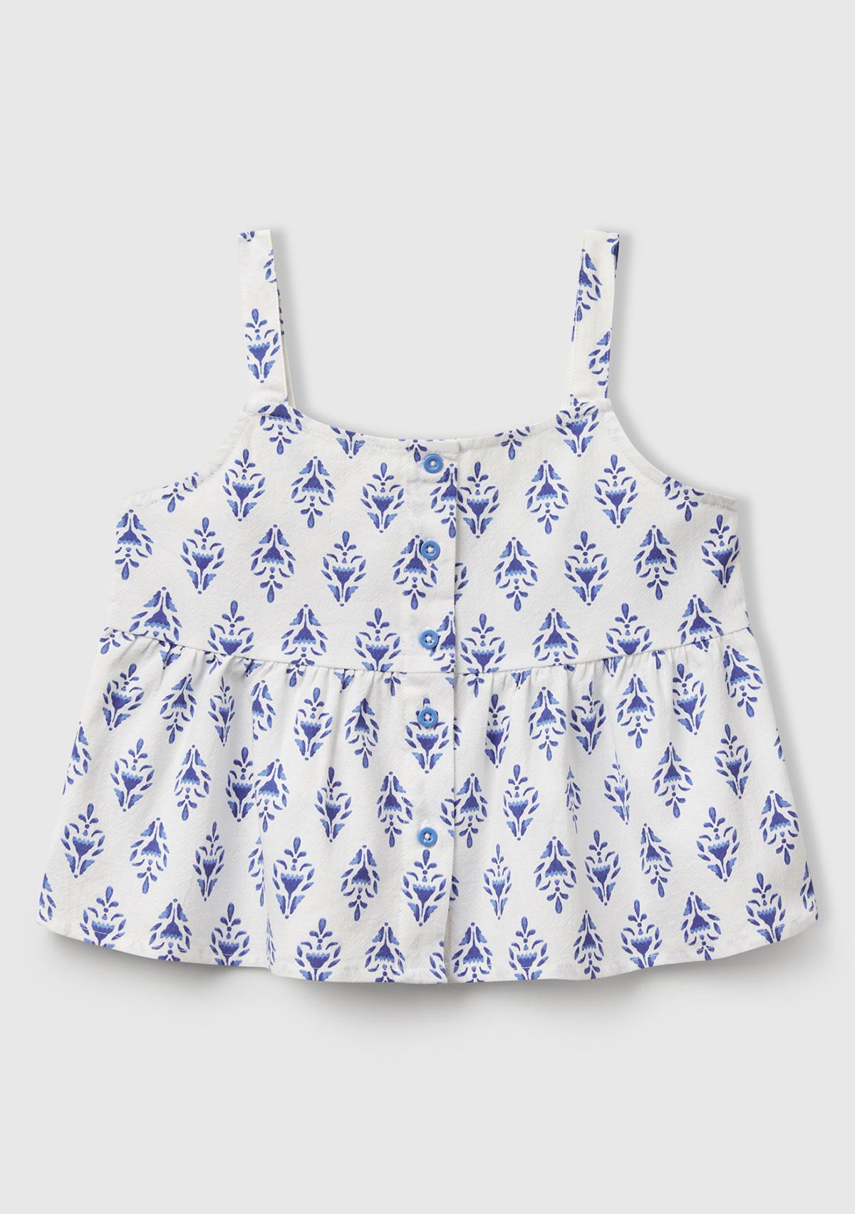 Kız Çocuk Mavi Desenli Pile Detaylı Önü Düğmeli Askılı Üst