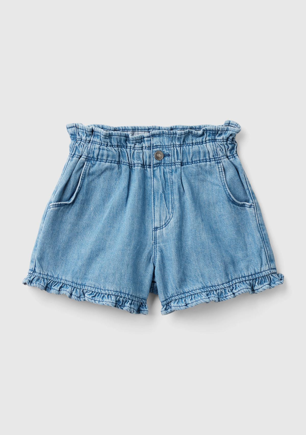 Saf pamuklu kumaştan üretilmiş, eskitilmiş efektli, arkası yama cepli, beli büzgülü ve fırfırlı, iç kısmı lastikli, fermuarlı, kız çocuk paperbag kısa şort. Paçalarındaki fırfır detayıyla romantik ve modern kombinler için rahat bir alternatif.