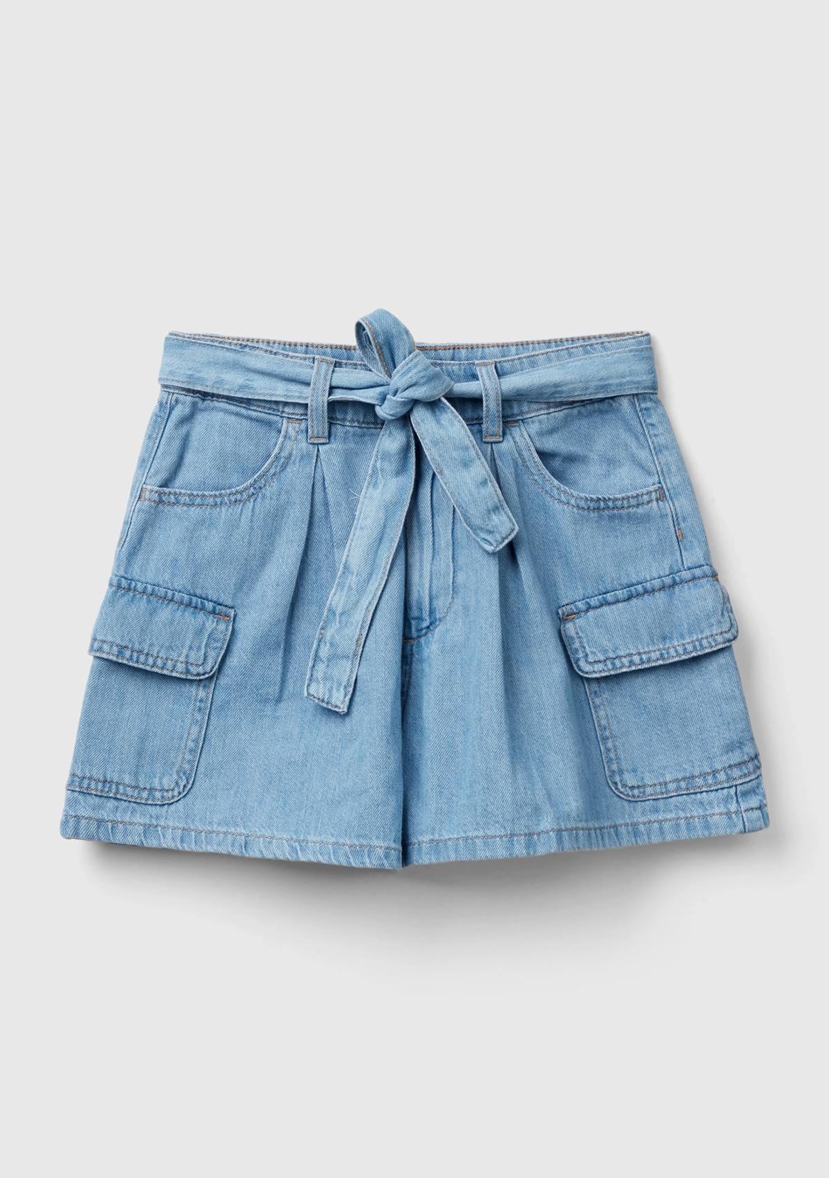 Kız Çocuk Mavi Kemer Delikli Beli Kuşaklı Denim Şort