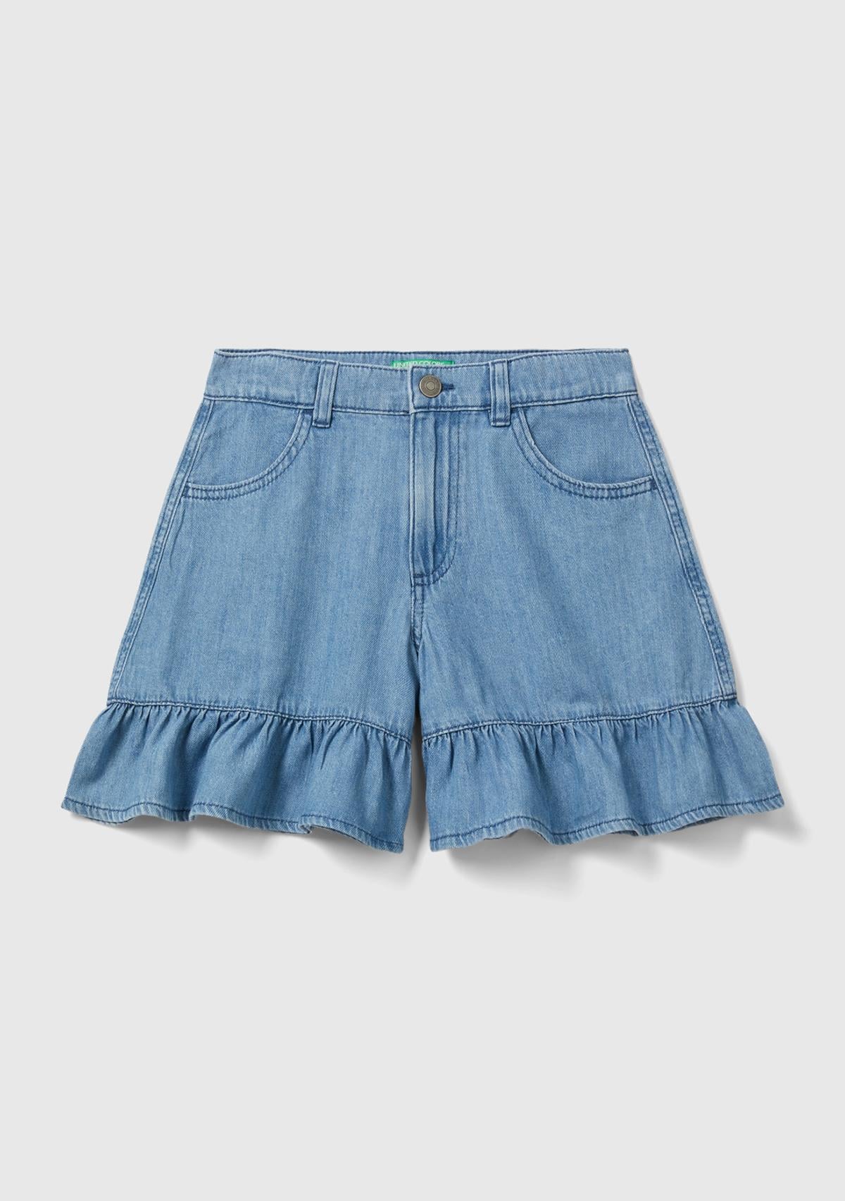Saf pamuklu kumaştan üretilmiş, kemer delikli, cepleri biyeli, önü fermuarlı ve düğmeli, kloş etek görünümlü kız çocuk denim şort. İç kısmındaki ayarlanabilir bel bandı sayesinde kolayca giyilebilir. Fırfırlı paça tasarımıyla sıcak günlerde romantik bir stil yaratmak isteyen genç kızlar için çarpıcı bir parça!
