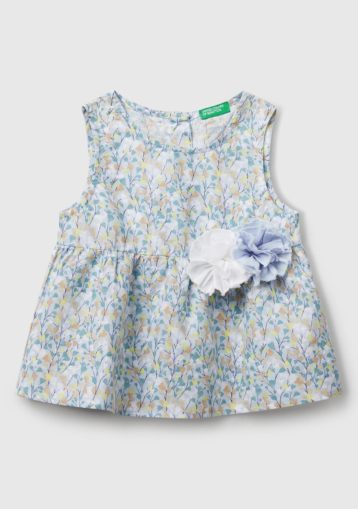 Kız Çocuk Mavi Keten Karışımlı Tamamı Desenli Çiçek Aplikeli Arkası Düğmeli Kolsuz Gömlek