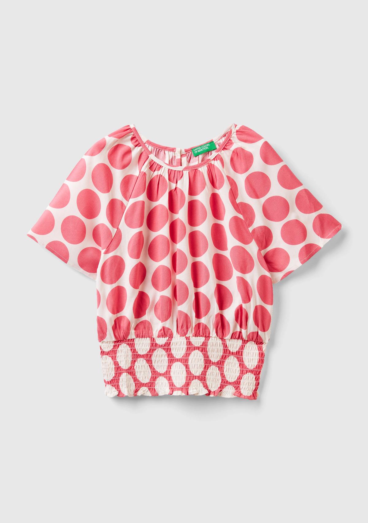 Kız Çocuk Pembe Beli Lastikli Puantiye Desenli Bluz