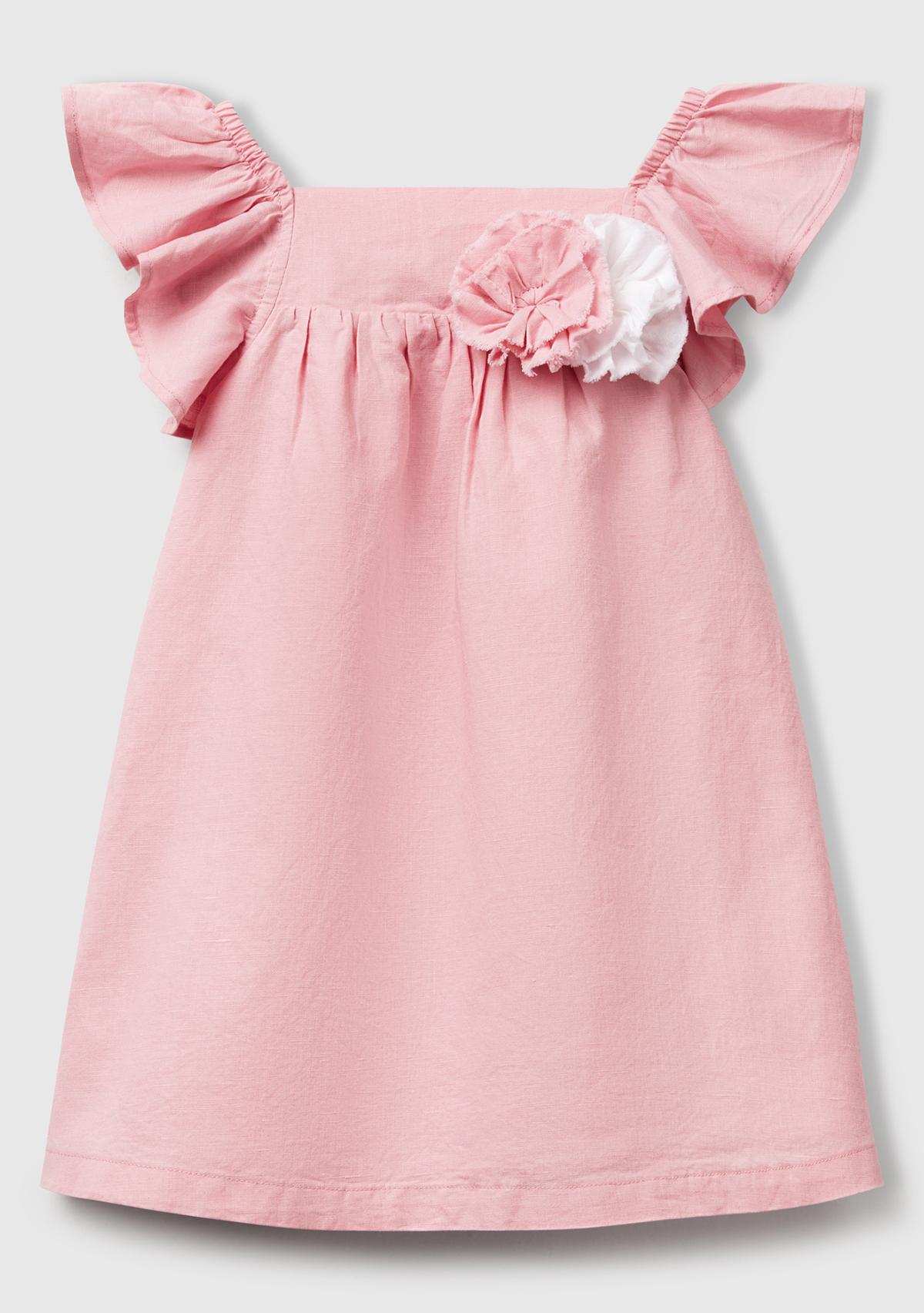 Kız Çocuk Pembe Keten Karışımlı Çiçek Aplikeli Askısı Fırfırlı Pileli Elbise