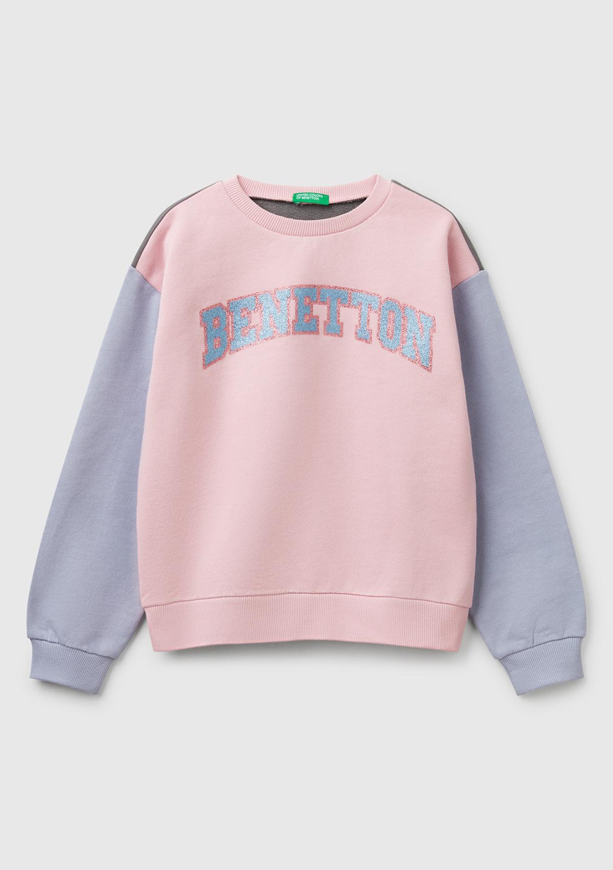 Kız Çocuk Pembe Mix Simli Benetton Logo Baskılı Bisiklet Yaka Sweatshirt