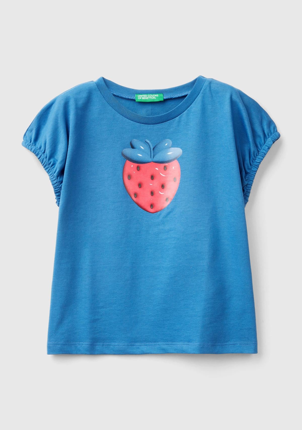 Kız Çocuk Saks Mavi Önü Grafik Baskılı Kolları Büzgülü Bisiklet Yaka T-Shirt