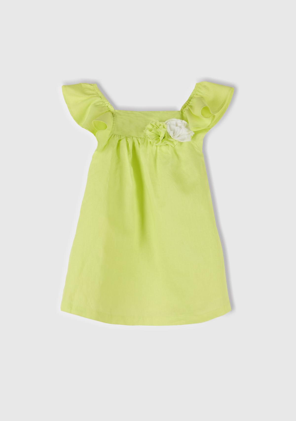 Kız Çocuk Sarı Keten Karışımlı Çiçek Aplikeli Askısı Fırfırlı Pileli Elbise