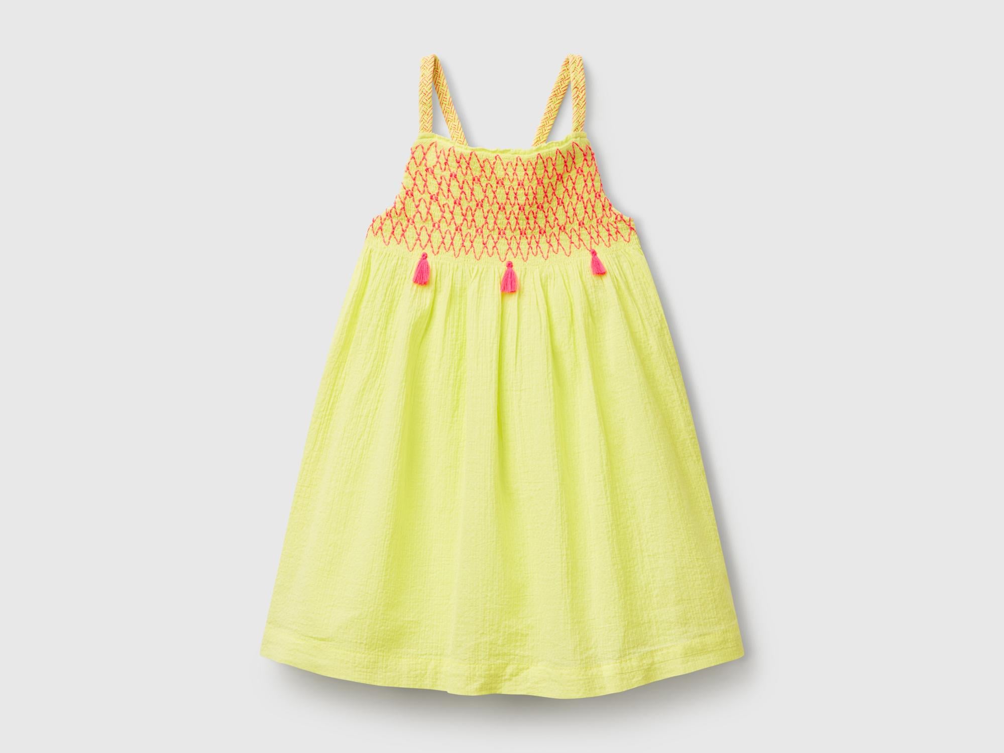 Kız Çocuk Sarı Kontrast Renk Önü Püsküllü Pileli İp Örgülü Askılı Elbise