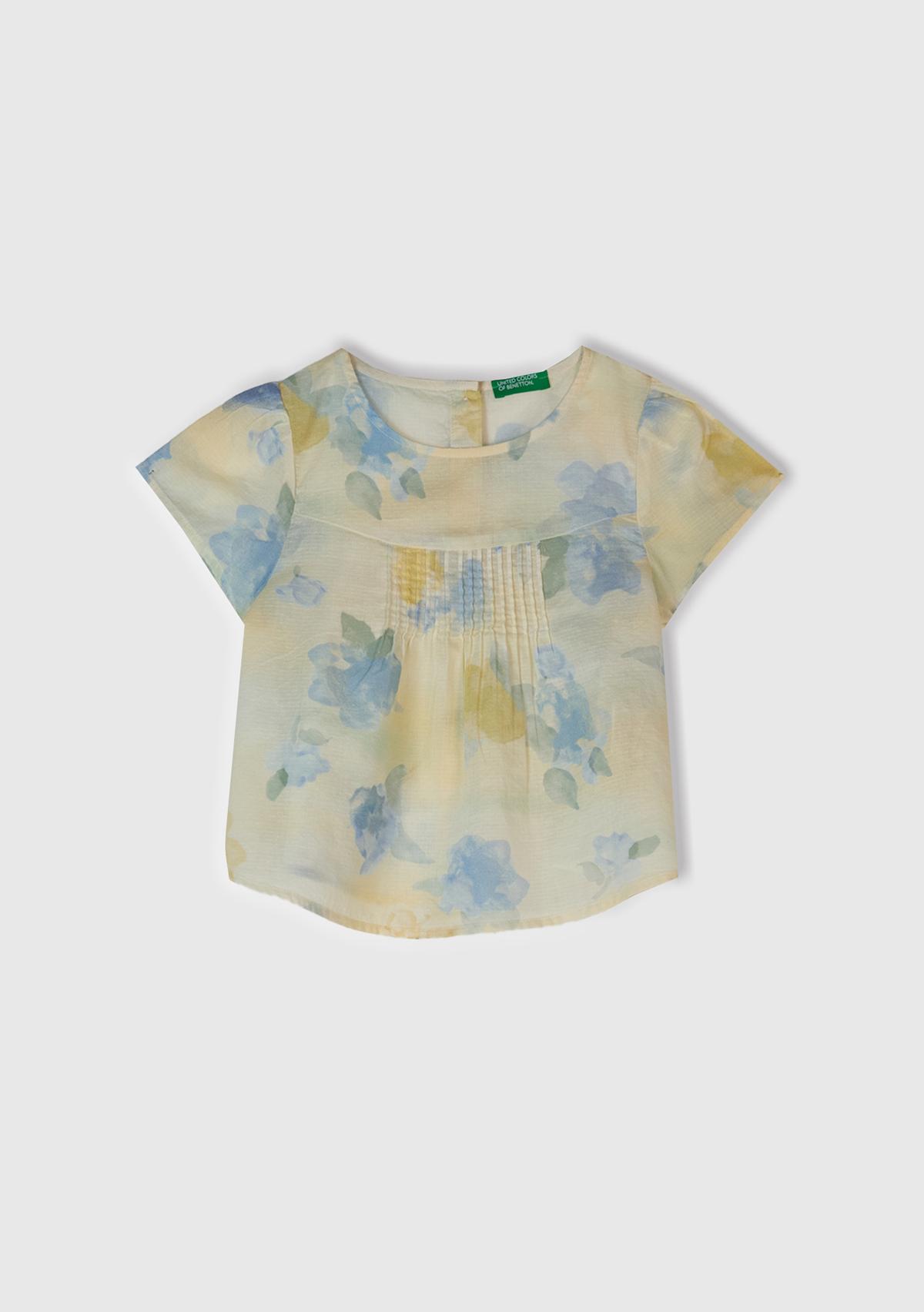 Kız Çocuk Sarı Mavi Tamamı Desenli Arkası Düğmeli Pileli Müslin Bluz