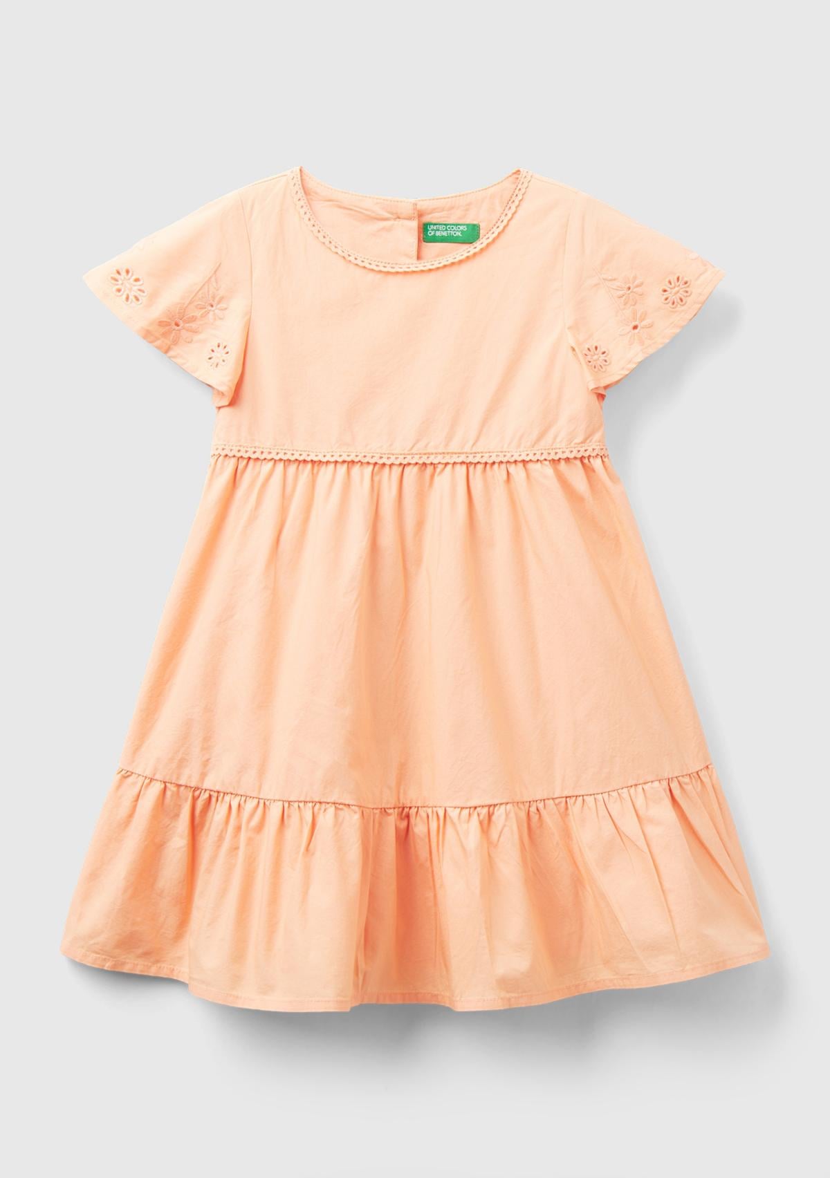 Saf pamuklu poplin kumaştan üretilmiş, kolları çiçek işlemeli, alt kısmı fırfırlı, arkası düğmeli kız çocuk elbisesi. Boyun ve bel kısmında bulunan dekoratif şerit detayıyla göz alıcı bir parça. Sevimli tasarımıyla spor ve şık kombinler için ideal.