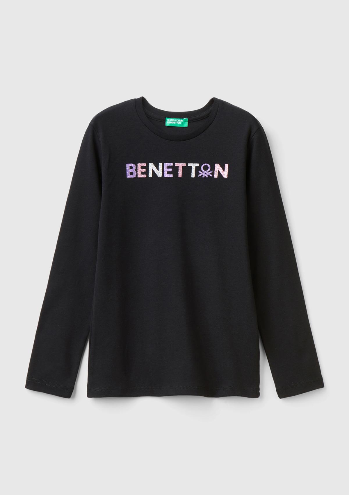 Kız Çocuk Siyah Önü Parıltılı Logo Baskılı Regular Fit Uzun Kollu T-Shirt