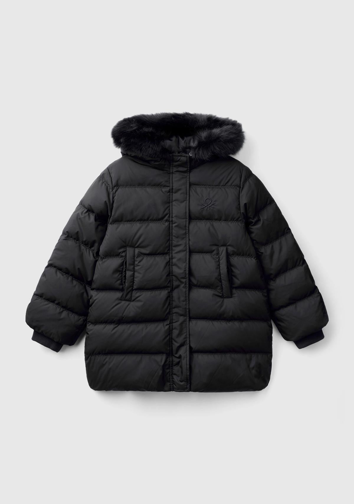 Kız Çocuk Siyah Sol Göğsü Logolu Çıkarılabilir Kapüşonlu Uzun Kuş Tüyü Ceket