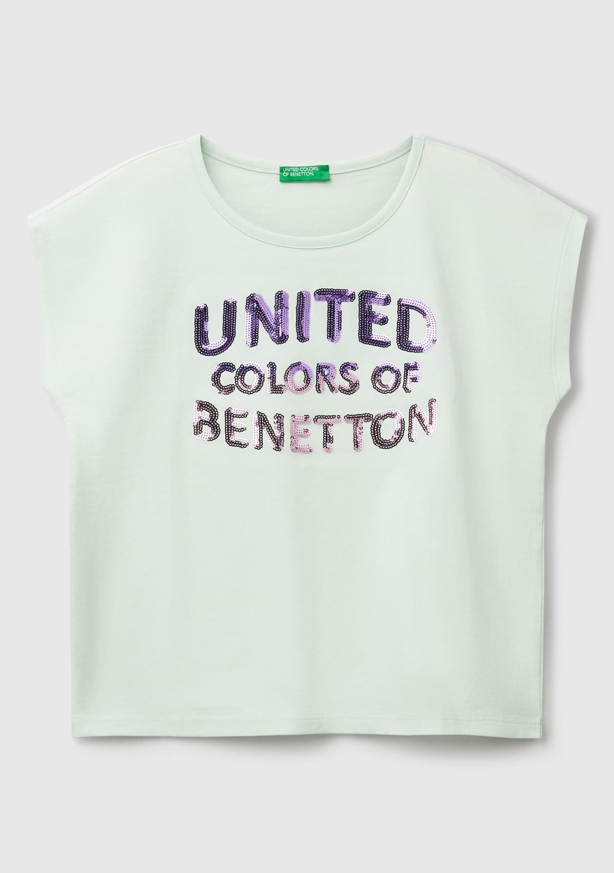 Kız Çocuk Su Yeşili Benetton Logo Baskılı T-Shirt