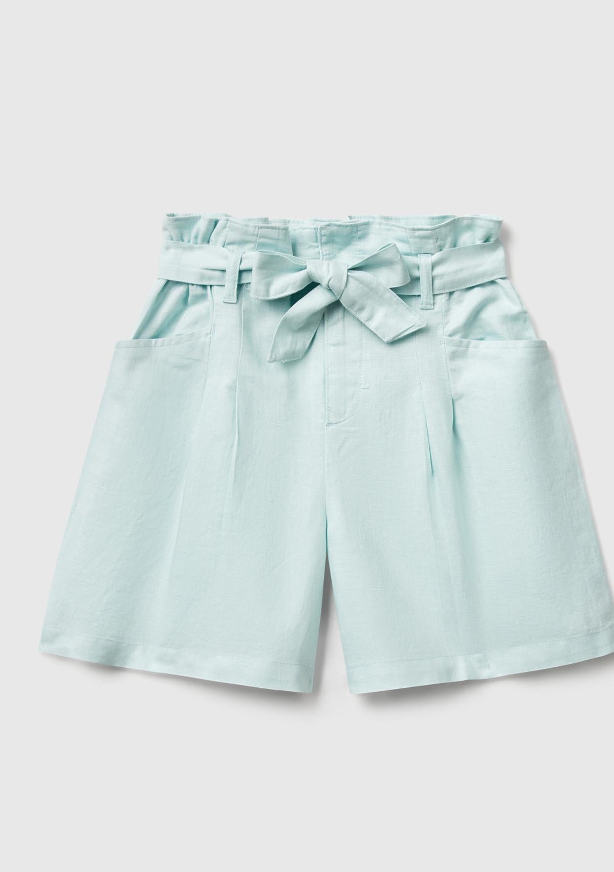Kız Çocuk Su Yeşili Keten Karışımlı Beli Kuşaklı Wide Fit Bermuda Şort