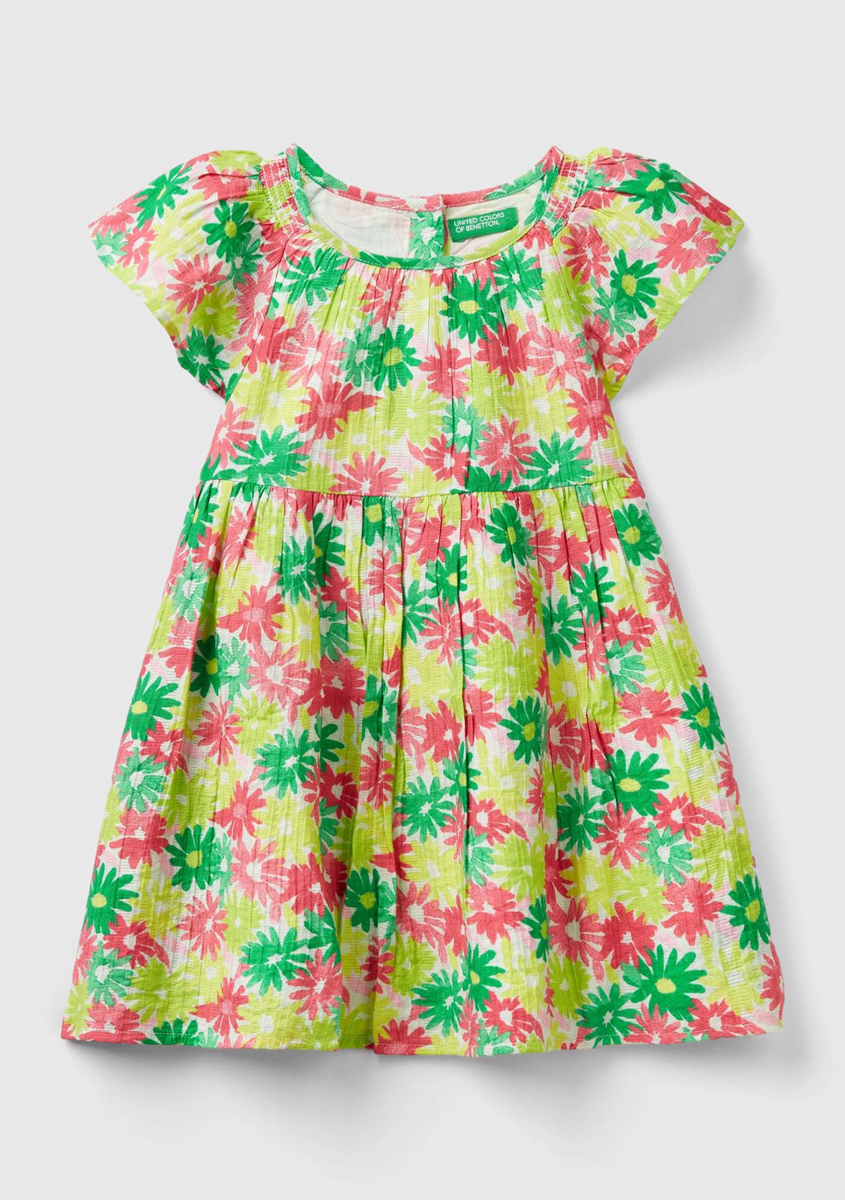 Kız Çocuk Yeşil- Pembe Tamamı Çiçek Baskılı Arkası Düğmeli Kısa Kollu Elbise