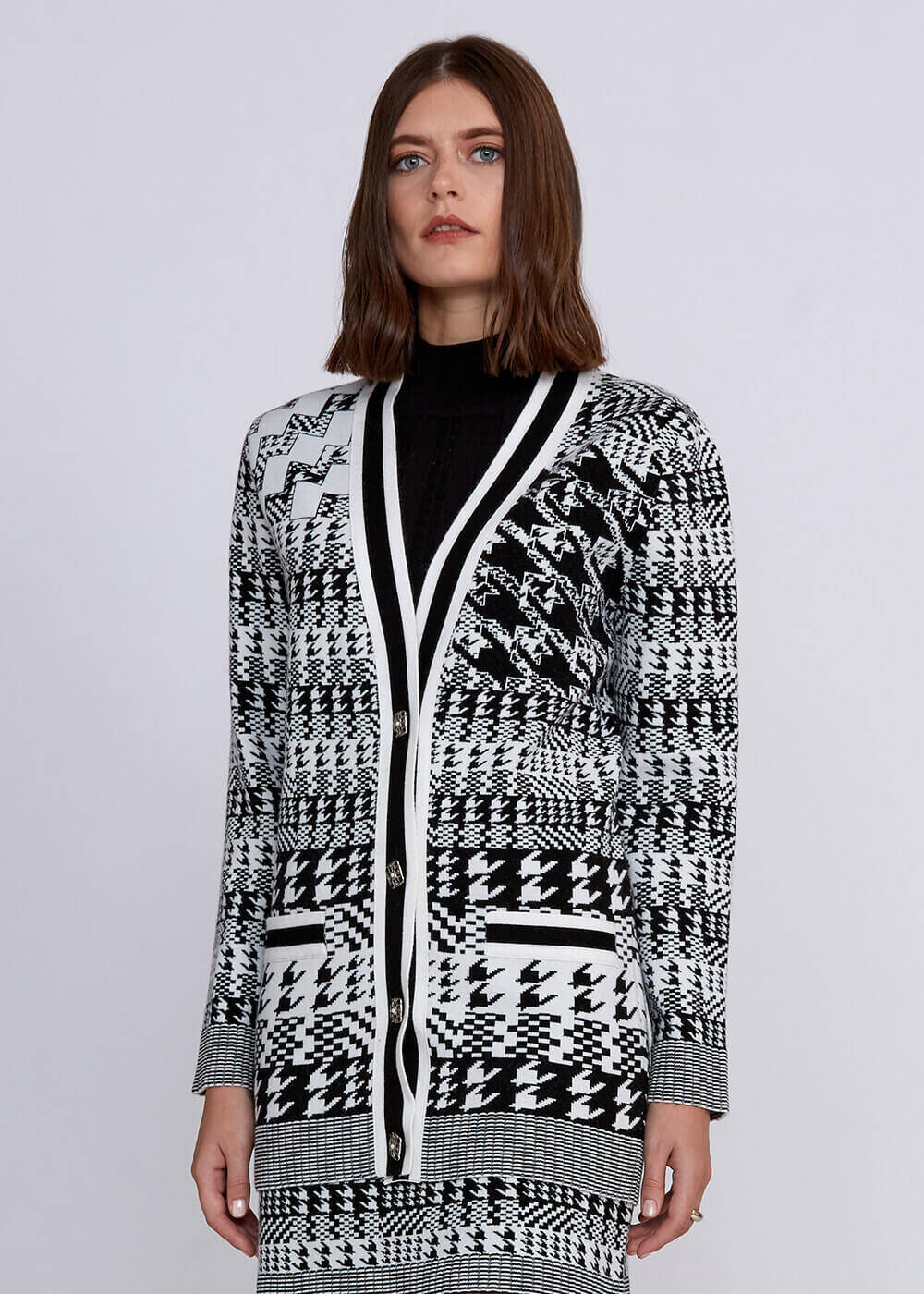 Knitss Geometrik Kaz Ayağı Desenli Siyah Beyaz Triko Hırka
