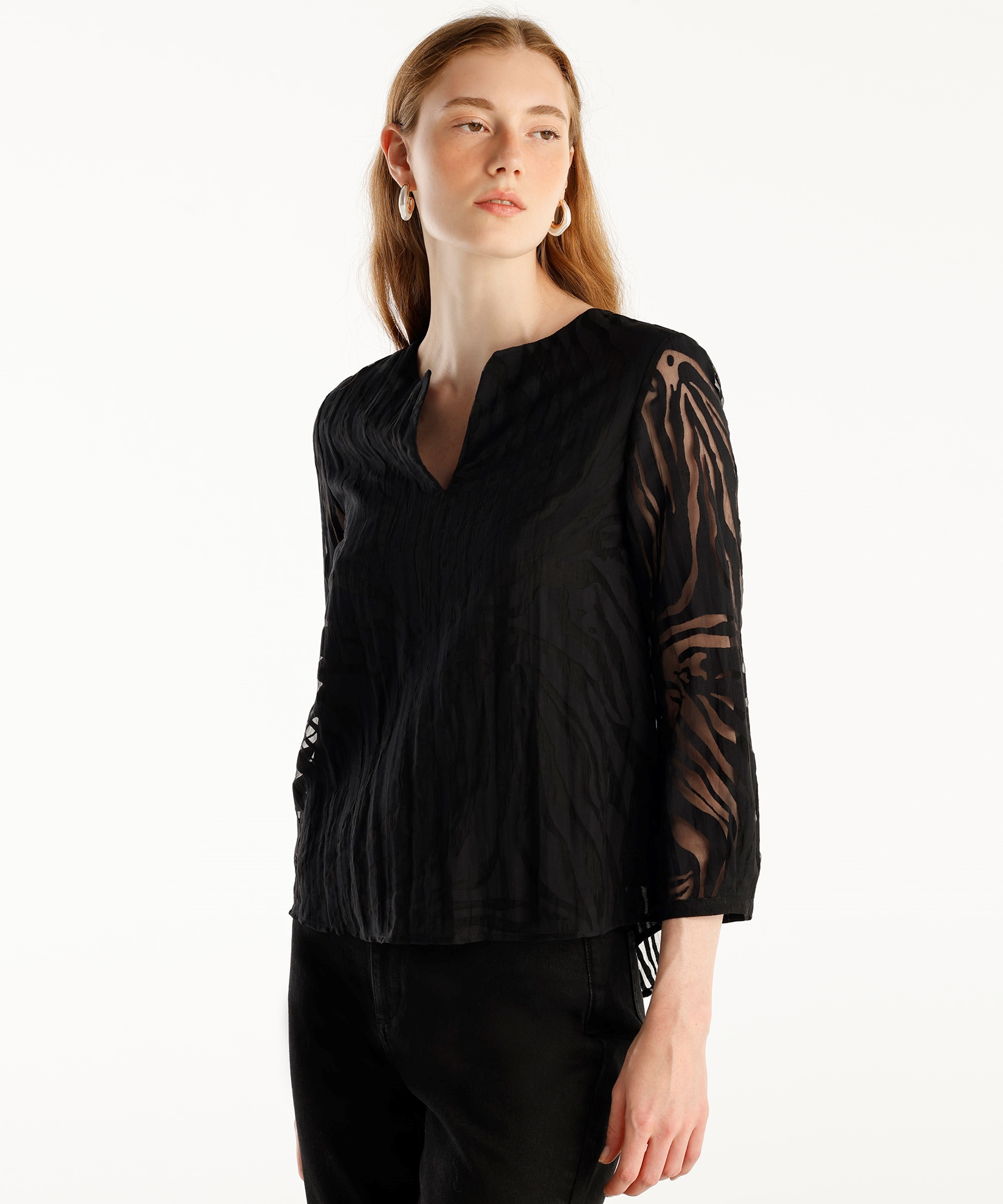 Materyal: 82-polyamid-18-viskon | Ürün Ölçüleri: Siyah ve transparan detaylarıyla dikkat çeken bu bluz, benzersiz bir dokuya sahip. Zarif ve iddialı bir tarz yaratmak isteyenler için ideal olan bu model, özel günlerde tercih edilebilir. Numune Bedeni: s Model Ölçüleri: Boy: 178 cm, Göğüs:80 cm, Bel: 60 cm, Kalça: 92 cm