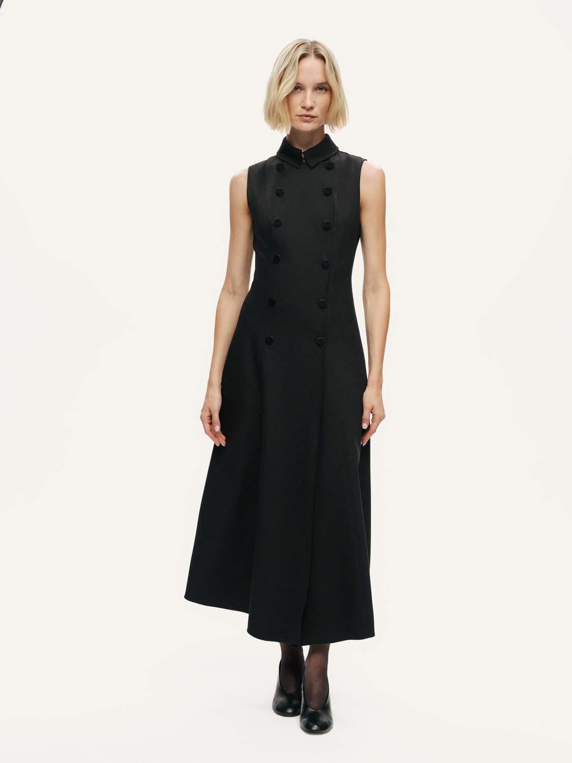 Modern terziliğin zamansız bir ifadesi. Bu kolsuz midi elbise, dik yaka ve kruvaze düğmeli ön kısmıyla yapılandırılmış ve zarif bir görünüm sunar. Bele oturan korsaj, beli belirginleştiren kontur dikişleriyle şekillendirilmiş ve temiz bir etek ucuna sahip A kesim eteğe dönüşmüştür. Pürüzsüz dokuma kumaştan üretilen bu elbise, gündüzden geceye zahmetsizce geçiş sağlayan şık bir silüet sunar. Kalıp: Regular Fit Beden Önerisi: Tam Beden Model Ürün Bedeni: S Model Bedeni: Boy 1.77 cm / Göğüs 82 cm / Bel 61 cm / Kalça 89 cm