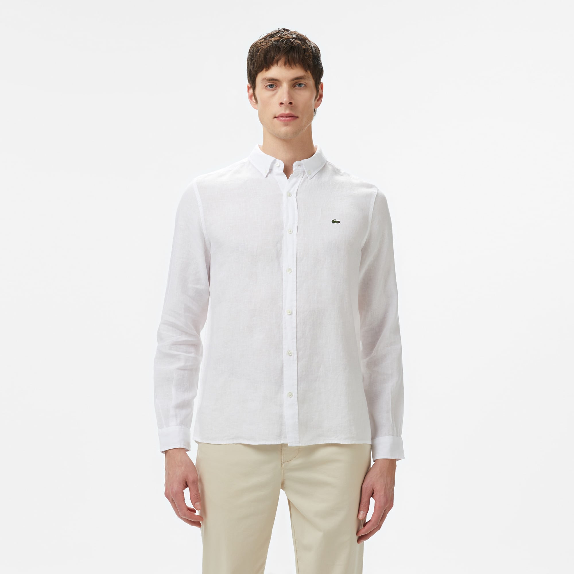 Lacoste Erkek Regular Fit Düğmeli Yaka Keten Beyaz Gömlek