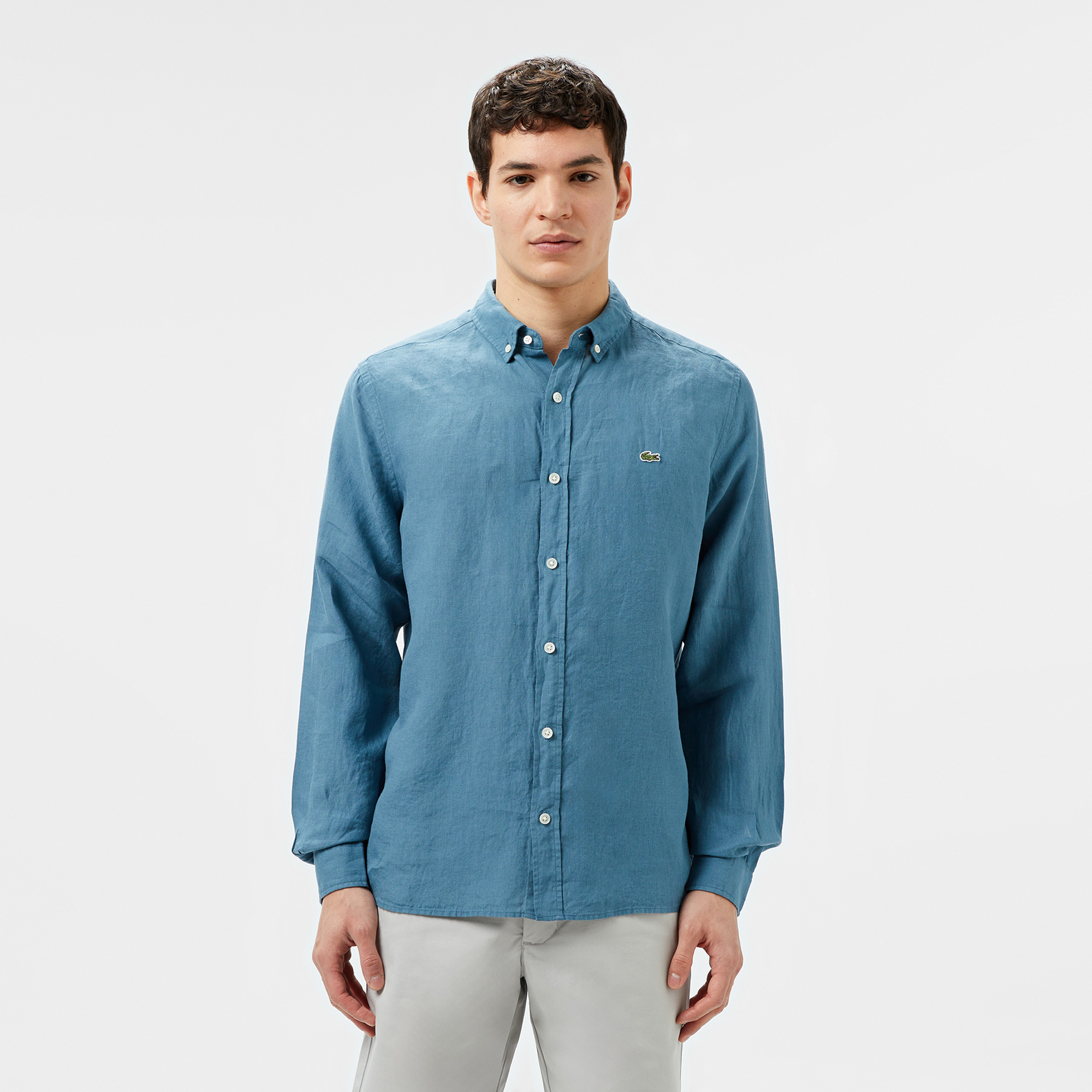 Lacoste Erkek Regular Fit Düğmeli Yaka Keten Mavi Gömlek